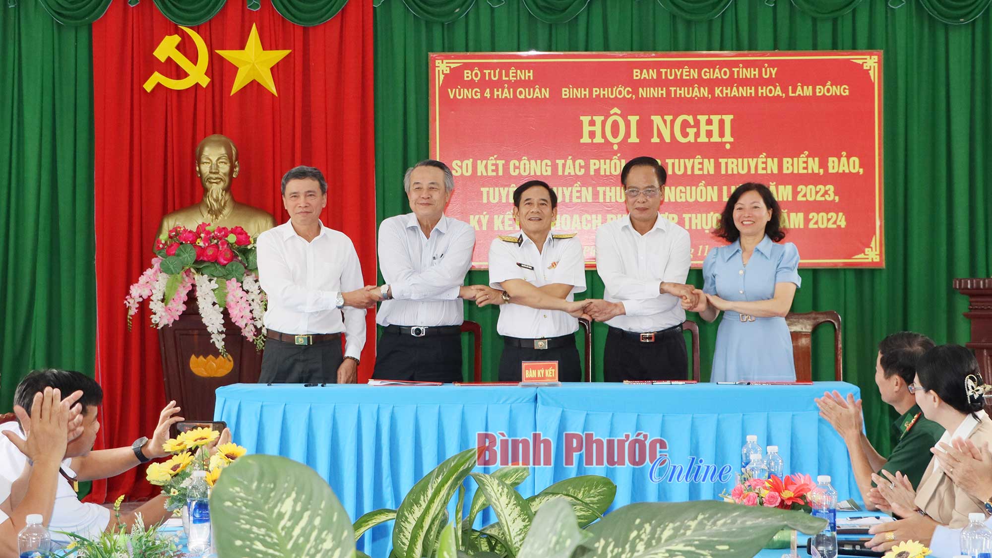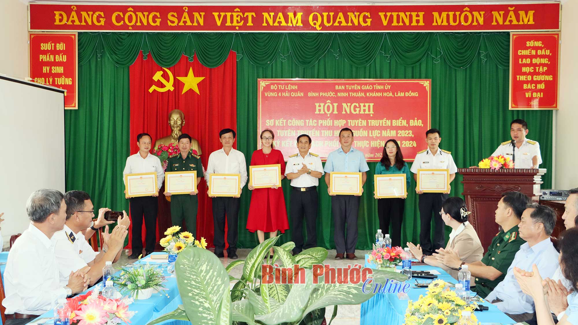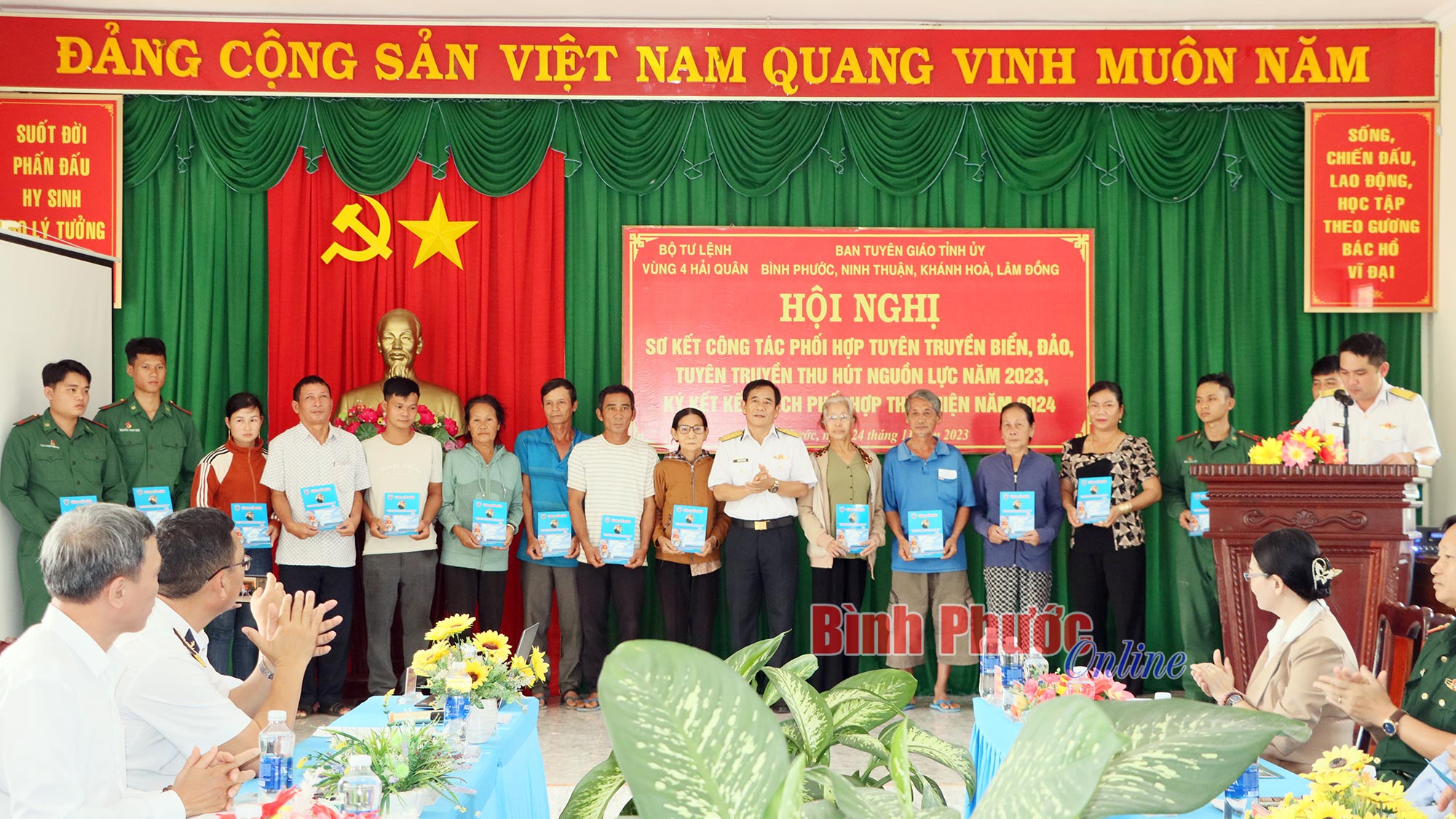 Tại hội nghị, Bộ Tư lệnh Vùng 4 Hải quân đã trao tặng 15 phần quà cho các gia đình chính sách tại huyện Bù Đốp; tặng giấy khen cho 8 cá nhân có thành tích tốt trong phối hợp hoạt động công tác tuyên truyền biển, đảo trong năm 2023.