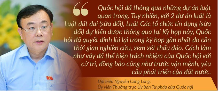 Bày tỏ sự tin tưởng vào những quyết sách đúng đắn của Chính phủ, Quốc hội, Đại biểu Nguyễn Công Long, Ủy viên Thường trực Ủy ban Tư pháp của Quốc hội phân tích: "Sau khi kỳ họp kết thúc, chúng ta phải bắt tay ngay vào hoàn thiện những dự án luật, dự thảo nghị quyết tiếp tục cho kỳ họp tới. Thời gian rất eo hẹp, chưa kể Quốc hội đã phải triển khai ngay các chương trình về giám sát, những nội dung quan trọng mà nghị quyết của Quốc hội đã thông qua. Do đó, thời gian tới, mỗi cơ quan của Quốc hội và từng đại biểu Quốc hội phải tập trung cao độ, phát huy cao tinh thần trách nhiệm để thực hiện các tốt nhiệm vụ. Điều này đặt ra một vấn đề là tỷ lệ đại biểu chuyên trách phải tăng lên để đáp ứng yêu cầu này".