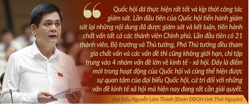 Đại biểu Nguyễn Lâm Thành (Đoàn ĐBQH tỉnh Thái Nguyên) cho rằng, Quốc hội đã thực hiện rất tốt và kịp thời công tác giám sát. Lần đầu tiên của Quốc hội tiến hành giám sát lại những nội dung đã được giám sát và kết luận, tiến hành chất vấn tất cả các thành viên Chính phủ. Lần đầu tiên có 21 thành viên, Bộ trưởng và Thủ tướng, Phó Thủ tướng đều tham gia chất vấn và các vấn đề cũng không giới hạn, không chỉ tập trung vào 4 nhóm vấn đề lớn về kinh tế - xã hội. Đây là điểm mới trong hoạt động của Quốc hội và cũng thể hiện được sự quan tâm của đại biểu Quốc hội, cử tri đối với những vấn đề kinh tế xã hội mà hiện nay đang rất cần giải quyết.