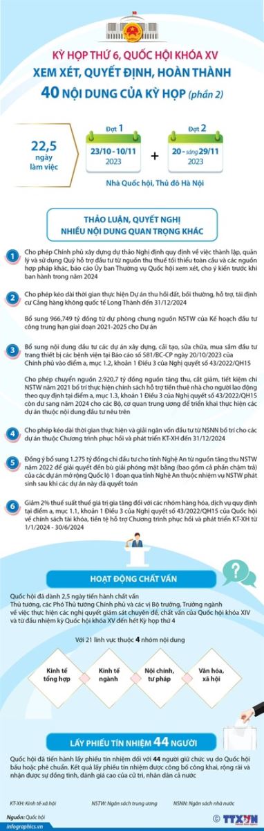 Để các luật, nghị quyết của Quốc hội sớm đi vào cuộc sống và phát huy hiệu quả, Quốc hội giao Ủy ban Thường vụ Quốc hội tổ chức quán triệt, triển khai các luật, nghị quyết đã được thông qua tại Kỳ họp thứ 6. Các vị đại biểu Quốc hội sớm báo cáo cử tri cả nước kết quả Kỳ họp, thường xuyên giữ mối liên hệ chặt chẽ, lắng nghe, phản ánh trung thực ý kiến và nguyện vọng của cử tri, nhất là về những vấn đề cấp bách nảy sinh trong thực tiễn đòi hỏi phải có quyết sách kịp thời, phù hợp; tích cực giám sát việc tổ chức, thi hành Hiến pháp và pháp luật, việc giải quyết các kiến nghị, khiếu nại, tố cáo của công dân. Các cấp, các ngành nỗ lực thực hiện có hiệu quả các chính sách an sinh xã hội, chăm lo đời sống vật chất, tinh thần của nhân dân, gia đình chính sách, người lao động, người có hoàn cảnh khó khăn; chuẩn bị chu đáo các điều kiện phục vụ nhân dân đón mừng năm mới 2024 và Tết Nguyên đán Giáp Thìn, bảo đảm mọi nhà, mọi người đều được vui Xuân, đón Tết đầm ấm.