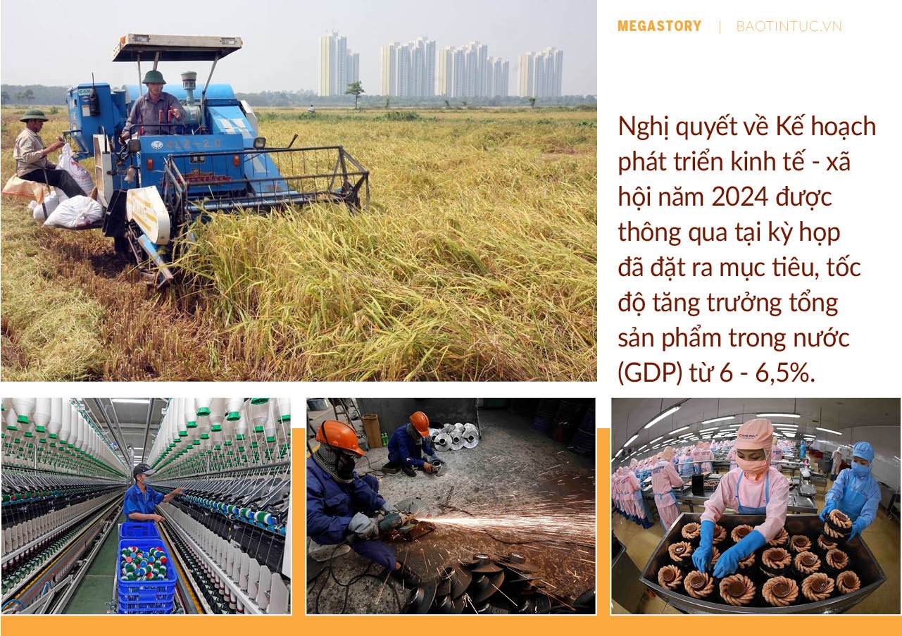 “Ở trong nước, bên cạnh những thời cơ, thuận lợi, chúng ta còn không ít hạn chế, yếu kém và phải tiếp tục đối mặt với nhiều khó khăn, thách thức lớn. Năm 2024 là năm bản lề, có ý nghĩa đặc biệt quan trọng trong việc thực hiện thắng lợi nhiệm vụ của cả nhiệm kỳ theo Nghị quyết Đại hội XIII của Đảng, Quốc hội nhấn mạnh yêu cầu tiếp tục ưu tiên thúc đẩy tăng trưởng kinh tế, giữ vững ổn định kinh tế vĩ mô, kiểm soát lạm phát, bảo đảm các cân đối lớn của nền kinh tế; vừa chú trọng giải quyết các khó khăn, tháo gỡ các vướng mắc trước mắt vừa phải bám sát các mục tiêu, yêu cầu đổi mới mô hình tăng trưởng, cơ cấu lại nền kinh tế, cải thiện môi trường đầu tư kinh doanh, nâng cao năng suất, chất lượng, hiệu quả, sức cạnh tranh và năng lực nội sinh của nền kinh tế, trên cơ sở thúc đẩy các đột phá chiến lược…”, Chủ tịch Quốc hội Vương Đình Huệ nhìn nhận.
