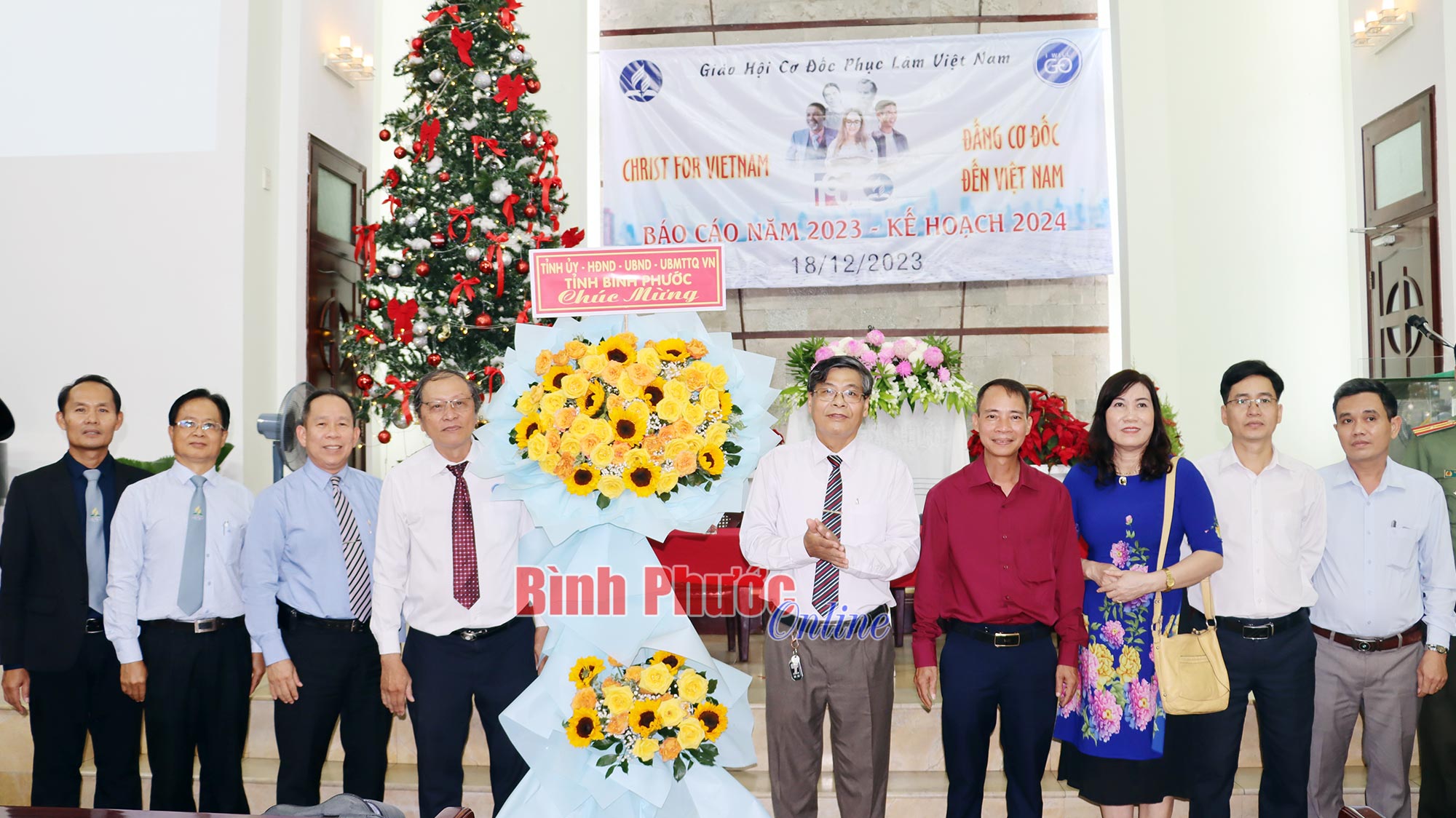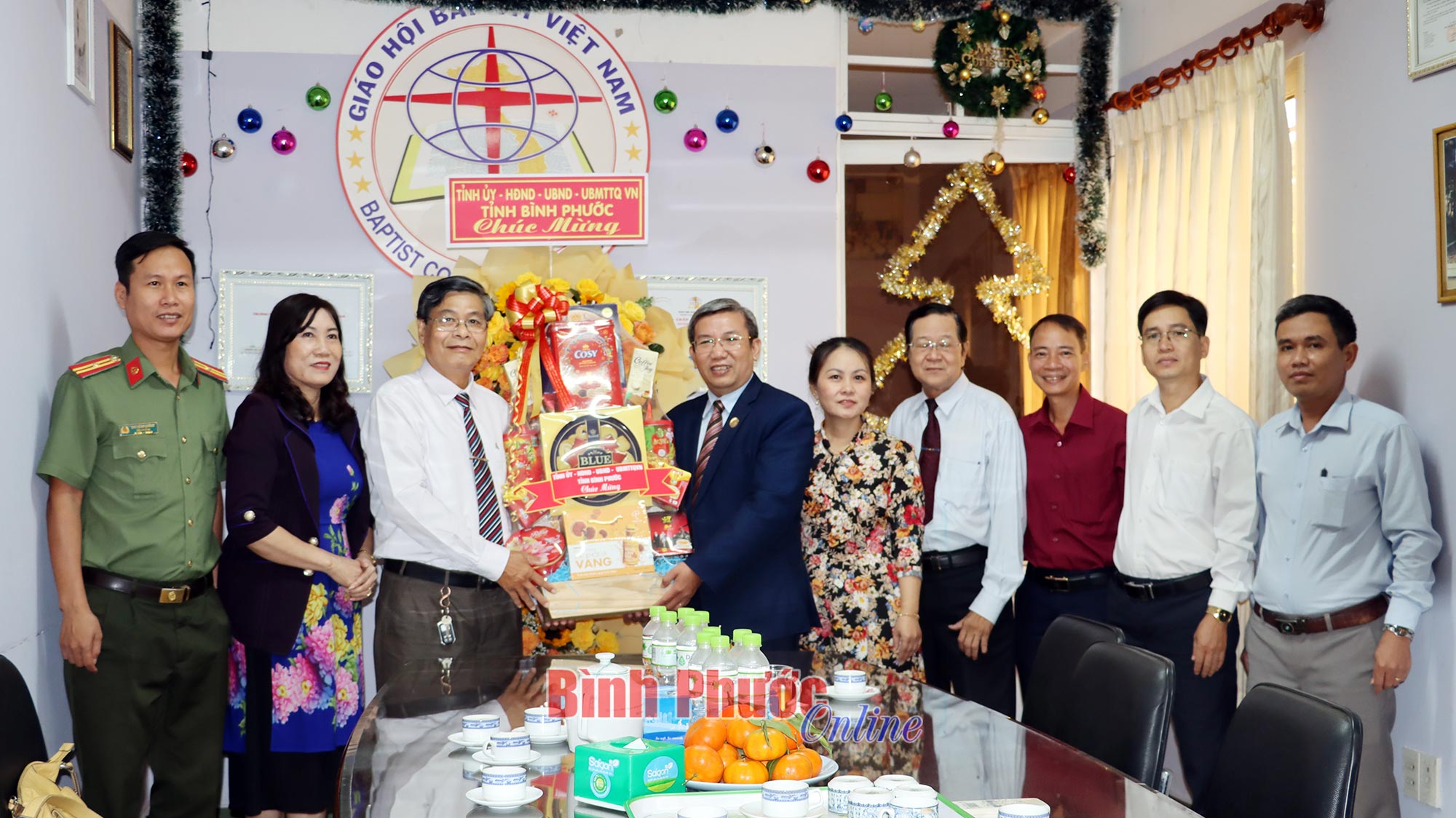 Tại các nơi đến thăm, Phó Chủ tịch Ủy ban MTTQ Việt Nam tỉnh Bình Phước Nguyễn Thanh Bình thay mặt Tỉnh ủy, HĐND, UBND, Ủy ban MTTQ Việt Nam tỉnh Bình Phước tặng lẵng hoa, quà và gửi lời chúc đến các mục sư và bà con giáo dân đón một mùa Giáng sinh vui tươi, an lành và năm mới hạnh phúc.