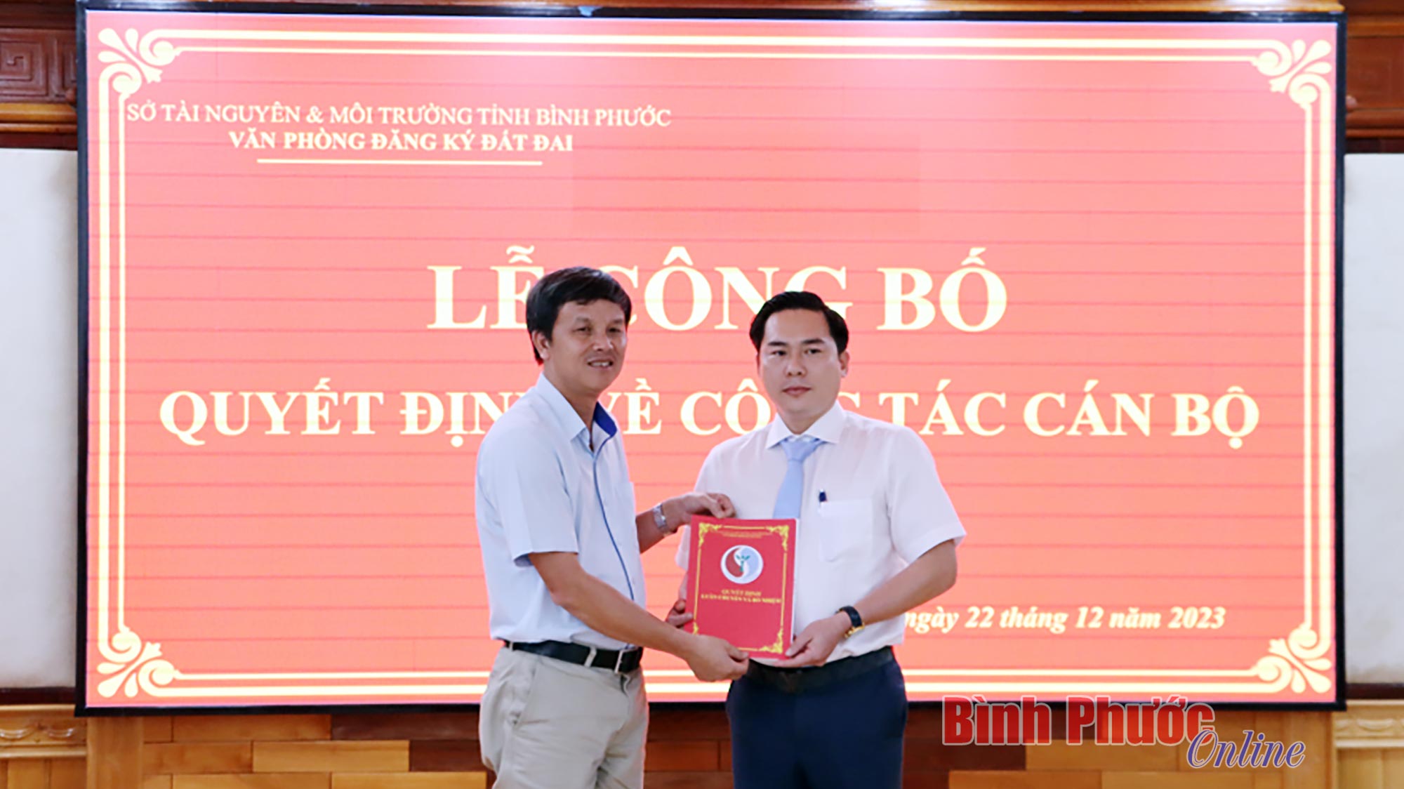 Giám đốc Văn phòng đăng ký đất đai tỉnh Nguyễn Thìn Bảy trao quyết định luân chuyển ông Lê Tiến Lâm giữ chức Giám đốc Chi nhánh văn phòng đăng ký đất đai huyện Phú Riềng
