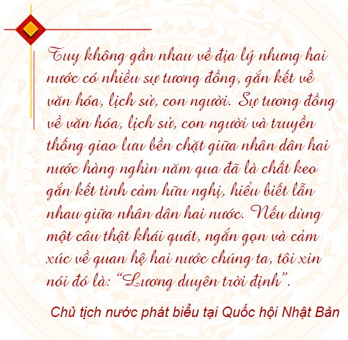 Với bài phát biểu được đánh giá là “từ trái tim, đến trái tim”, hết sức ấn tượng” tại Quốc hội Nhật Bản, Chủ tịch nước đã dùng những ngôn từ và câu chuyện rất bình dị, mộc mạc nhưng rất ý nghĩa và sâu lắng. Nhà Lãnh đạo Việt Nam cho rằng, chính sự tương đồng về văn hóa, lịch sử, con người và truyền thống giao lưu bền chặt giữa nhân dân hai nước hàng nghìn năm qua là chất keo gắn kết tình cảm hữu nghị, hiểu biết lẫn nhau giữa nhân dân hai nước.
