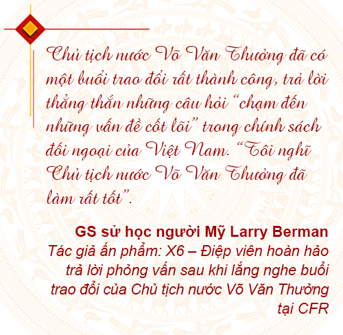 Nhiều nhà ngoại giao đánh giá, ấn tượng đặc biệt nhất của Chủ tịch nước Võ Văn Thưởng trong chuyến công tác tại San Francisco là cuộc đối thoại về chính sách đầy hào hứng và thuyết phục trước các học giả, nhà nghiên cứu tên tuổi của Hội đồng quan hệ quốc tế Hoa Kỳ (CFR).