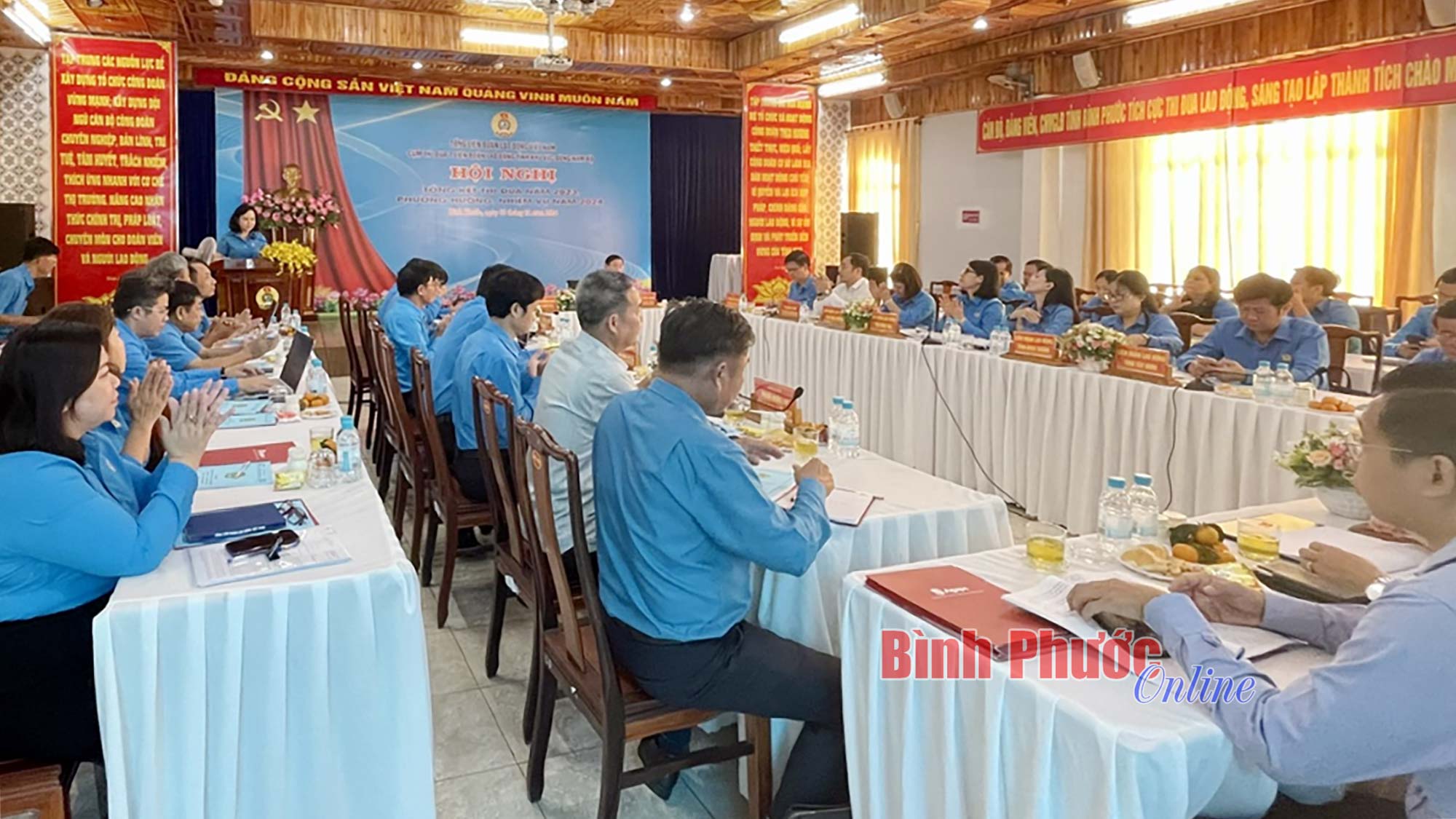 Toàn cảnh hội nghị tổng kết hoạt động Cụm thi đua 7 Liên đoàn lao động tỉnh khu vực Đông Nam Bộ năm 2023