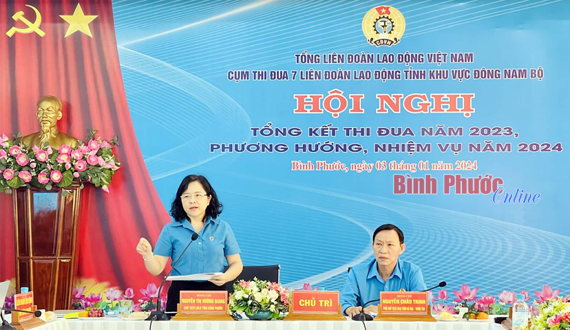 Tỉnh ủy viên, Chủ tịch LĐLĐ tỉnh Bình Phước, Cụm trưởng Cụm thi đua 7 Nguyễn Thị Hương Giang; Phó Chủ tịch LĐLĐ tỉnh Bà Rịa - Vũng Tàu Nguyễn Châu Trinh, Cụm phó đồng chủ trì hội nghị.