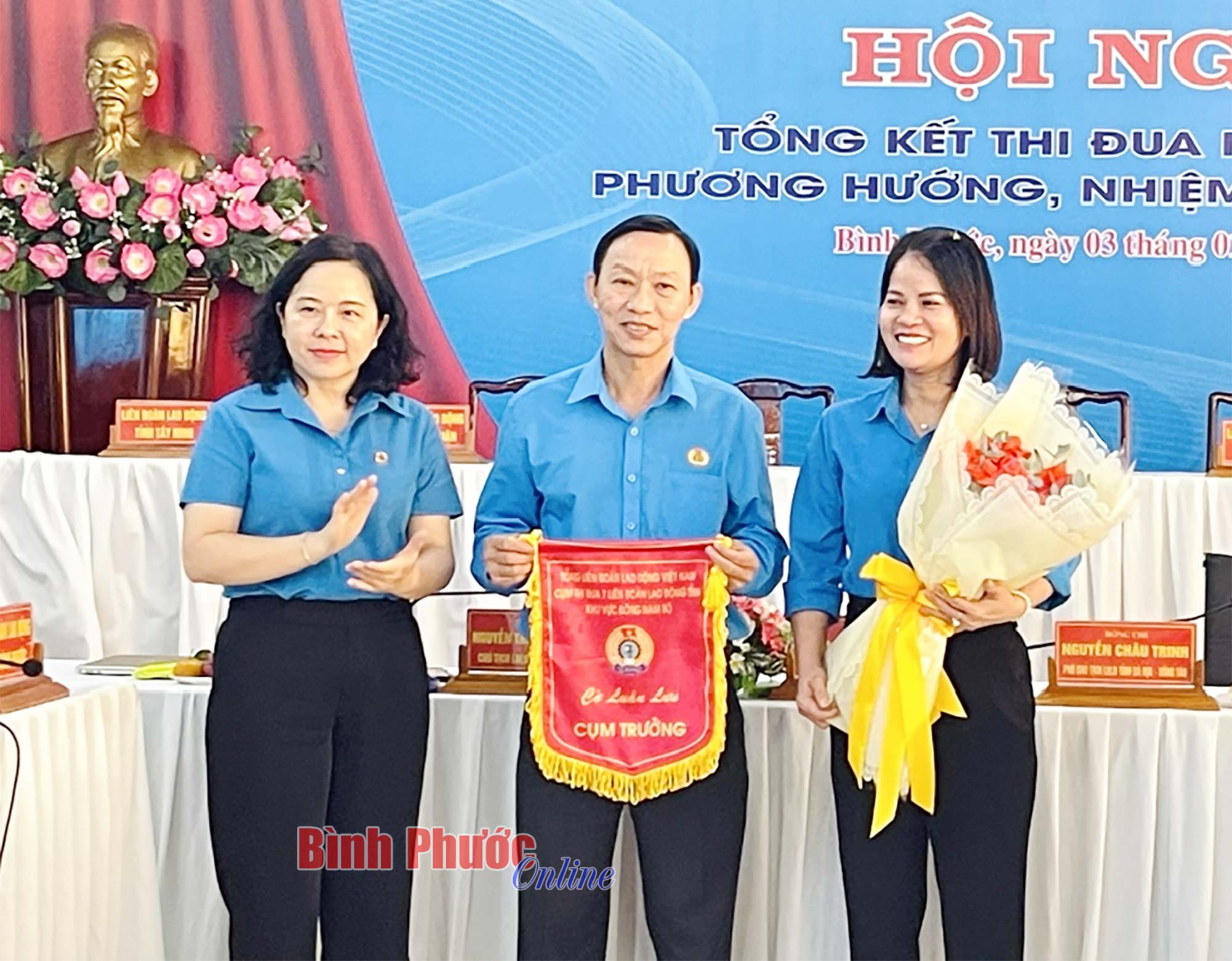 Tỉnh ủy viên, Chủ tịch Liên đoàn Lao động tỉnh Bình Phước Nguyễn Thị Hương Giang trao cờ luân lưu cụm trưởng Cụm thi đua 7 năm 2024 cho Liên đoàn Lao động tỉnh Bà Rịa - Vũng Tàu và cụm phó là Liên đoàn Lao động tỉnh Bình Dương
