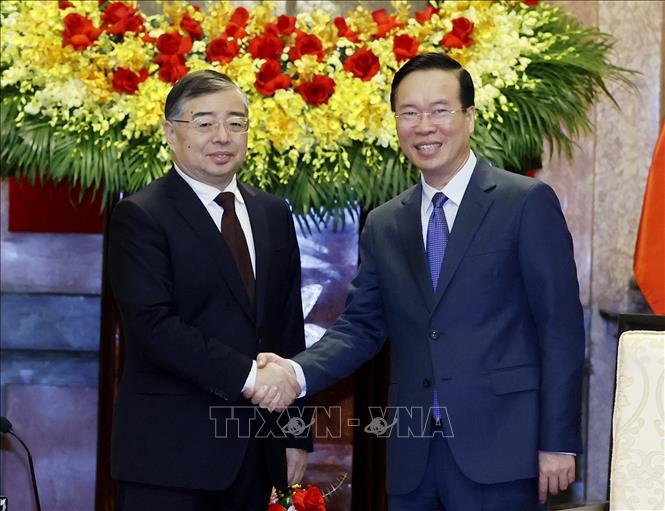 Chủ tịch nước Võ Văn Thưởng tiếp đồng chí Lý Thư Lỗi, Ủy viên Bộ Chính trị, Bí thư Ban Bí thư, Trưởng Ban Tuyên truyền Trung ương Đảng Cộng sản Trung Quốc. Ảnh: Thống Nhất/TTXVN