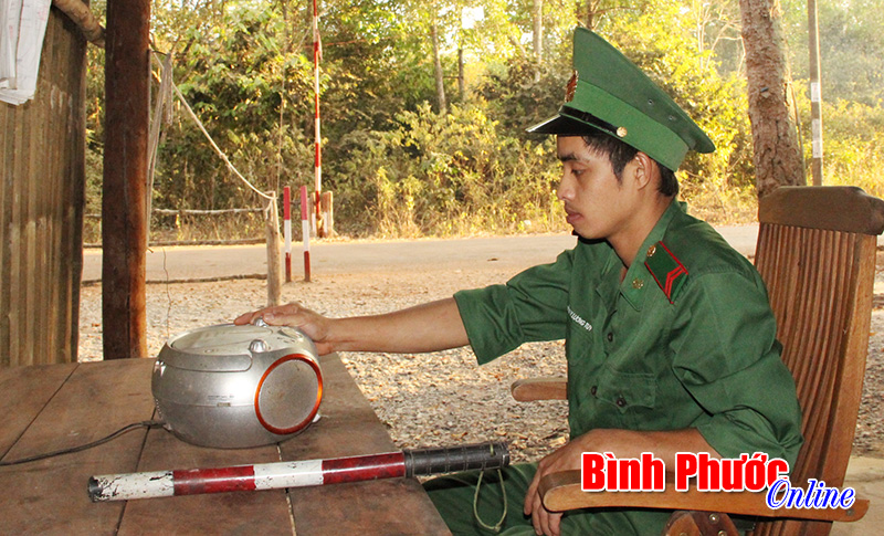 Chiến sĩ BĐBP bảo vệ rừng Tà Thiết (Lộc Ninh) hướng về đại hội bằng cách nghe tin tức qua radio