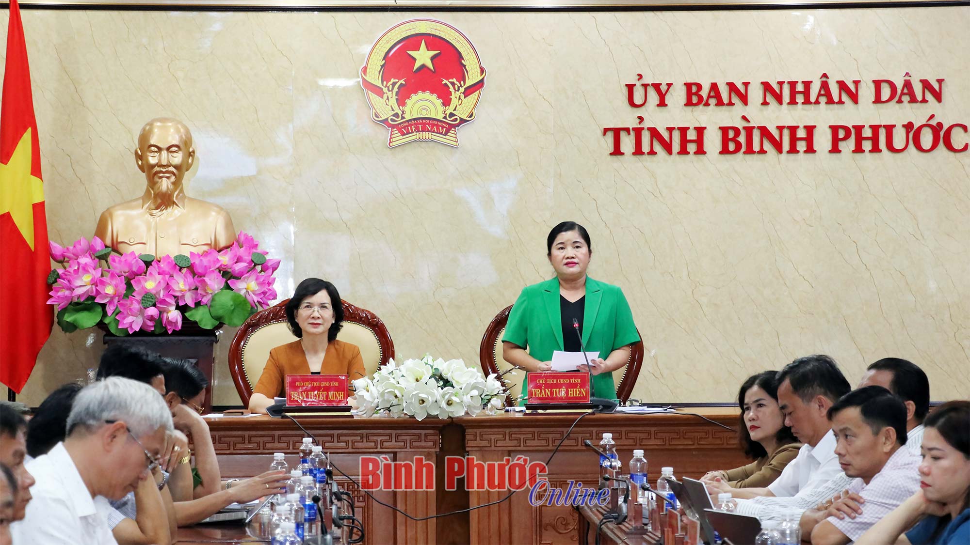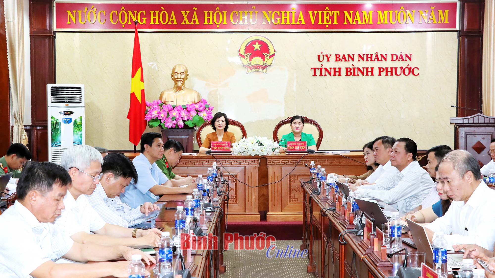 Chủ tịch UBND tỉnh Trần Tuệ Hiền, Phó Chủ tịch UBND tỉnh Trần Tuyết Minh và các đại biểu dự phiên họp tại điểm cầu Bình Phước