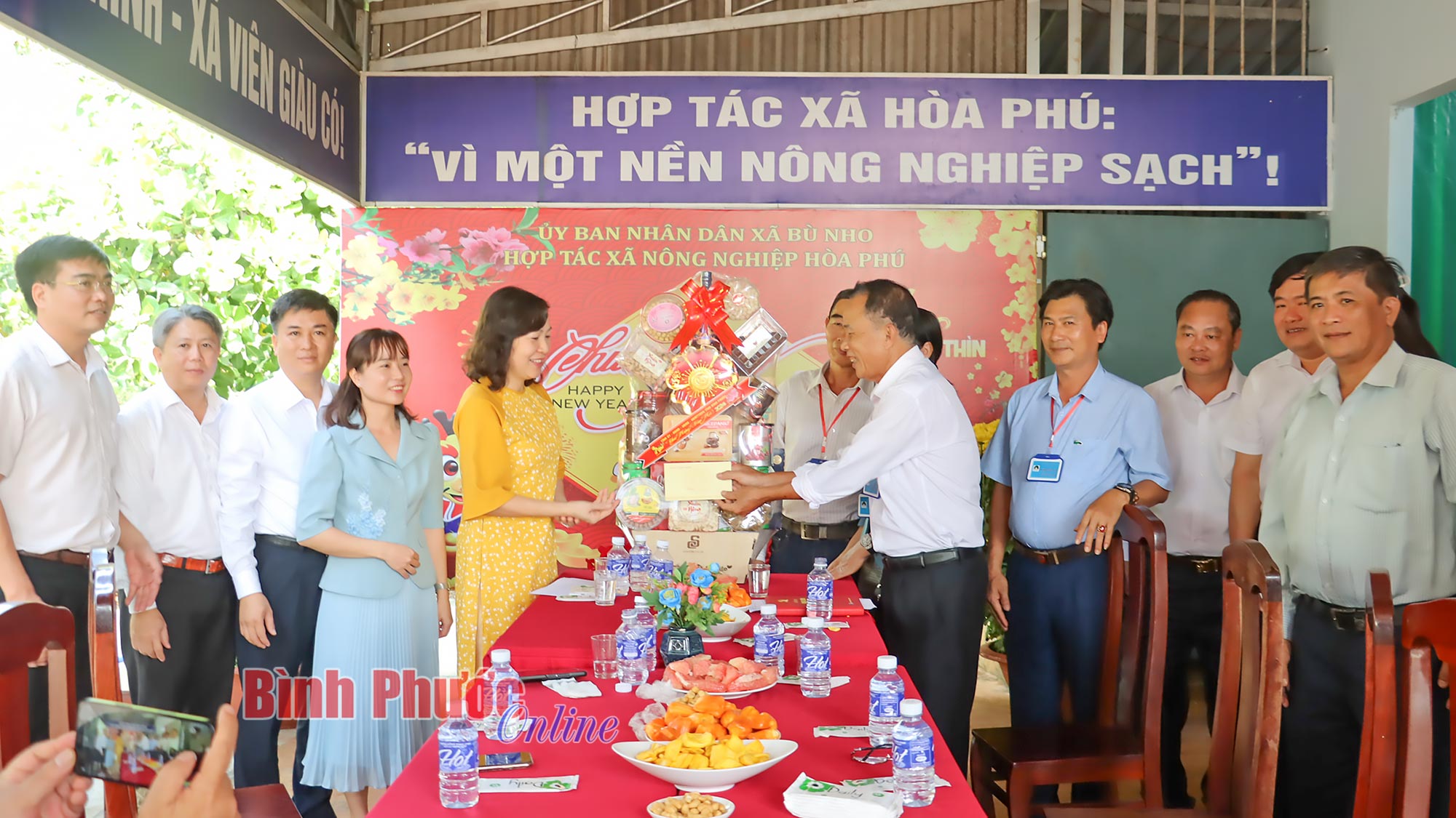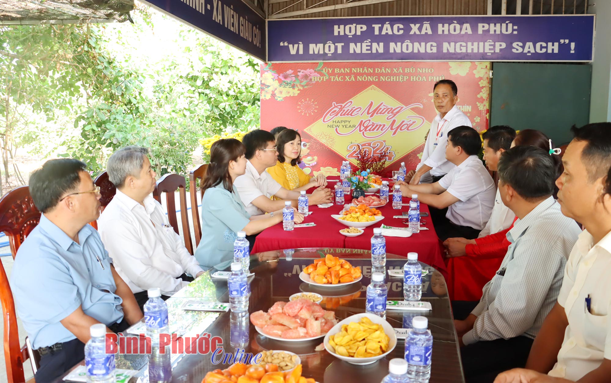 Cũng trong sáng nay, đoàn công tác đến thăm và chúc tết cán bộ, thành viên Hợp tác xã Nông nghiệp sạch Hòa Phú, huyện Phú Riềng. Tại đây, đoàn đã nghe đại diện hợp tác xã báo cáo tình hình hoạt động sản xuất, kinh doanh năm 2023 và chiến lược phát triển trong năm 2024. Hiện hợp tác xã có tổng diện tích 386 ha với 45 thành viên, kinh doanh đa dạng sản phẩm nông nghiệp và có hai đơn vị thành viên liên kết.