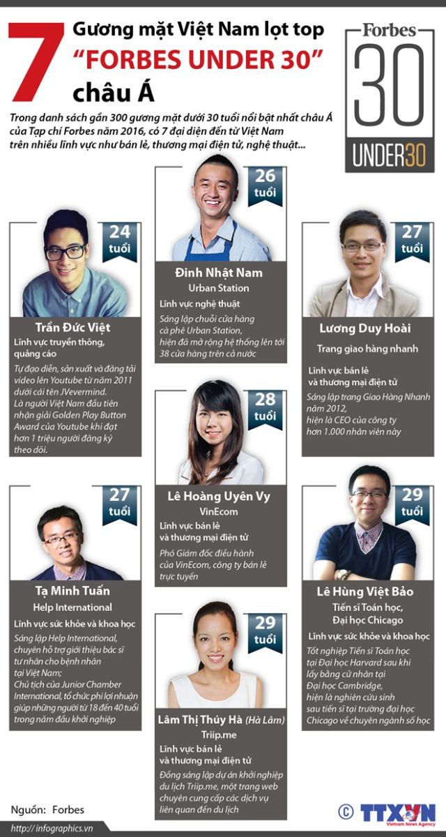 BPO - Trong danh sách gần 300 gương mặt dưới 30 tuổi nổi bật nhất châu Á của Tạp chí Forbes năm 2016, có 7 đại diện đến từ Việt Nam trên nhiều lĩnh vực.