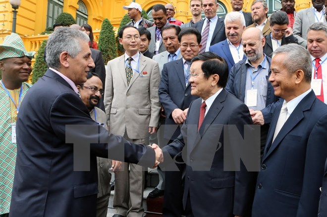 Vui mừng chào đón Đoàn đại biểu Liên hiệp Công đoàn Thế giới sang tham dự Hội nghị Hội đồng Chủ tịch Liên hiệp Công đoàn Thế giới, Chủ tịch nước Trương Tấn Sang đánh giá cao sự ủng hộ mạnh mẽ, sự giúp đỡ và tình đoàn kết quốc tế cao cả của phong trào công nhân và công đoàn quốc tế dưới sự lãnh đạo của Liên hiệp Công đoàn Thế giới, đã dành cho tổ chức công đoàn, công nhân lao động và nhân dân Việt Nam trong cuộc đấu tranh giành độc lập dân tộc trước đây, cũng như trong công cuộc xây dựng và bảo vệ đất nước hiện nay.