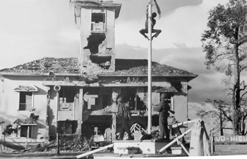 Chiến sĩ Quân đoàn 4 cắm cờ “Quyết chiến quyết thắng” trên dinh Tỉnh trưởng Phước Long lúc 10 giờ 30 phút ngày 6-1-1975 - Ảnh: Tư liệu