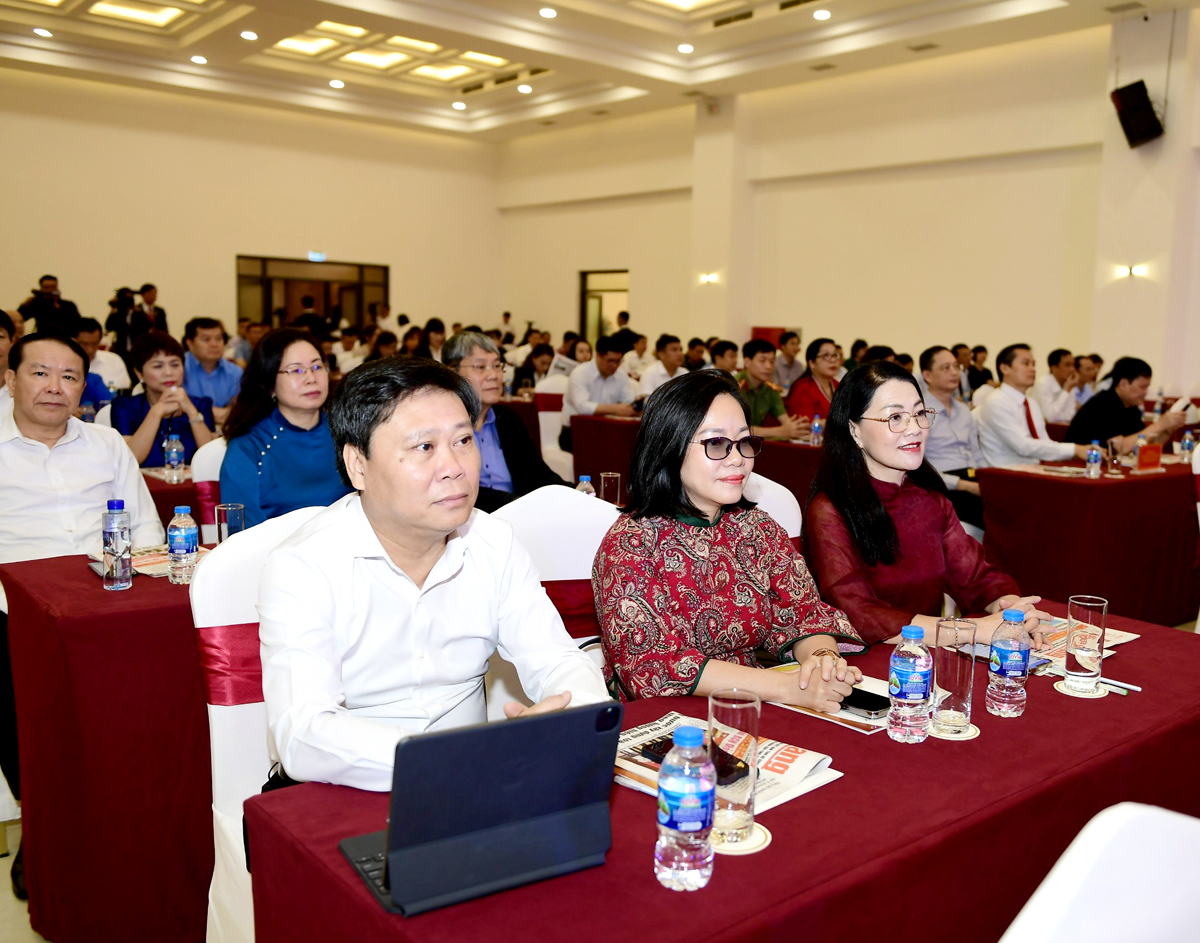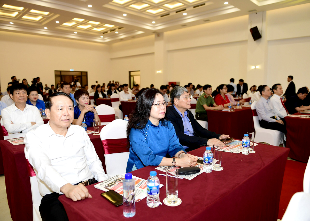 Đồng chí Lê Quốc Minh, Ủy viên T.Ư Đảng, Tổng Biên tập Báo Nhân Dân, Phó Trưởng ban Tuyên giáo T.Ư, Chủ tịch Hội Nhà báo Việt Nam chụp ảnh cùng các đại biểu tại lễ kỷ niệm. |