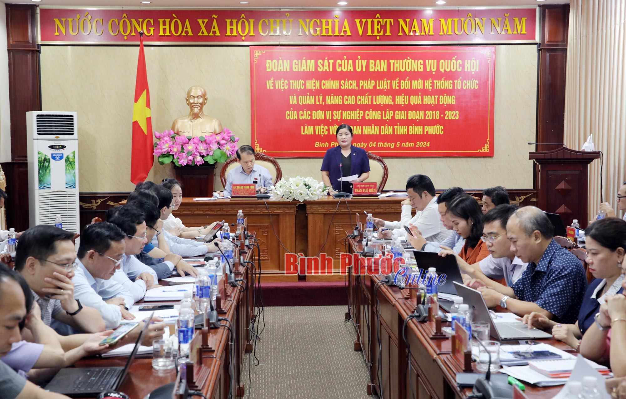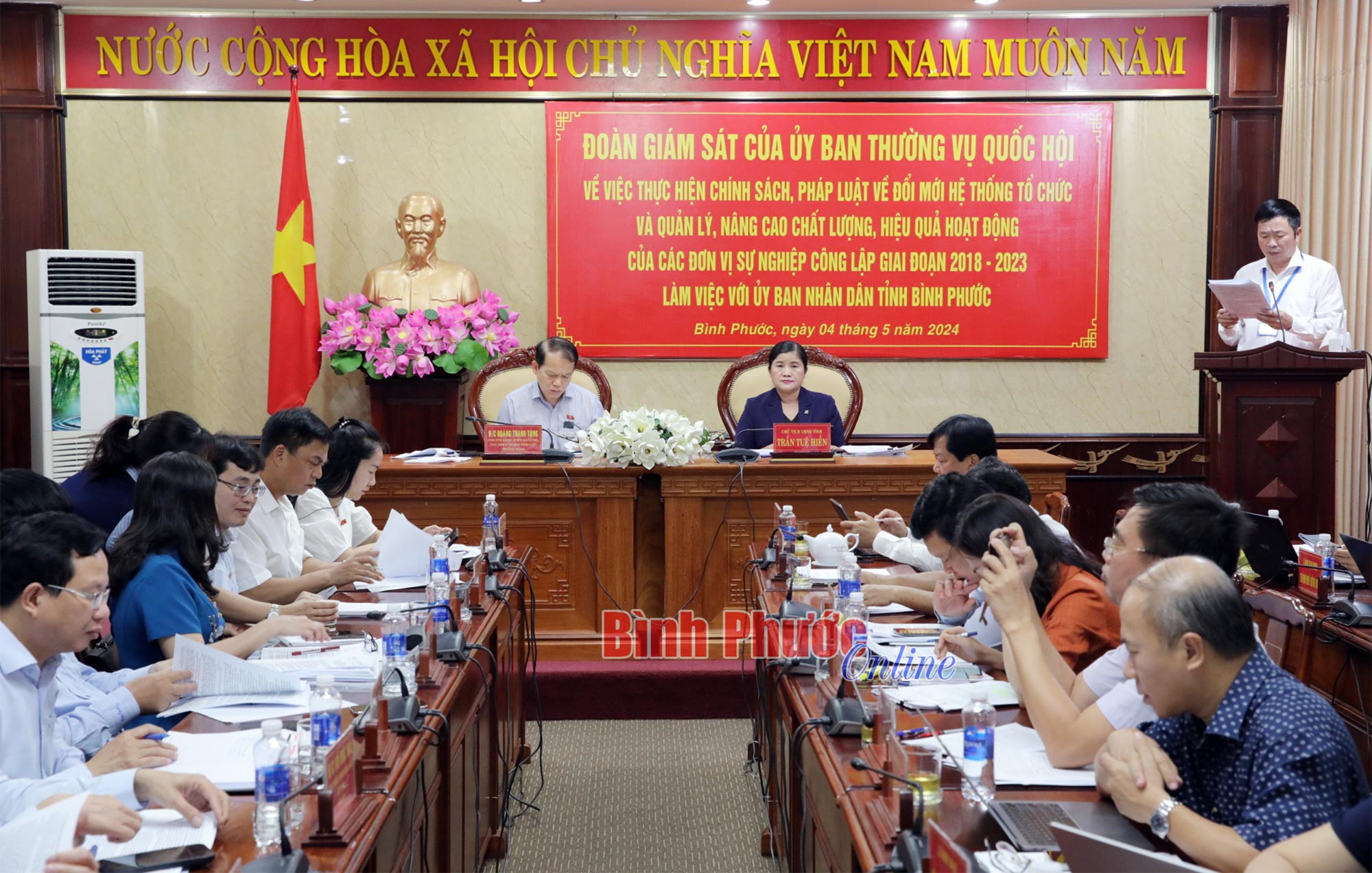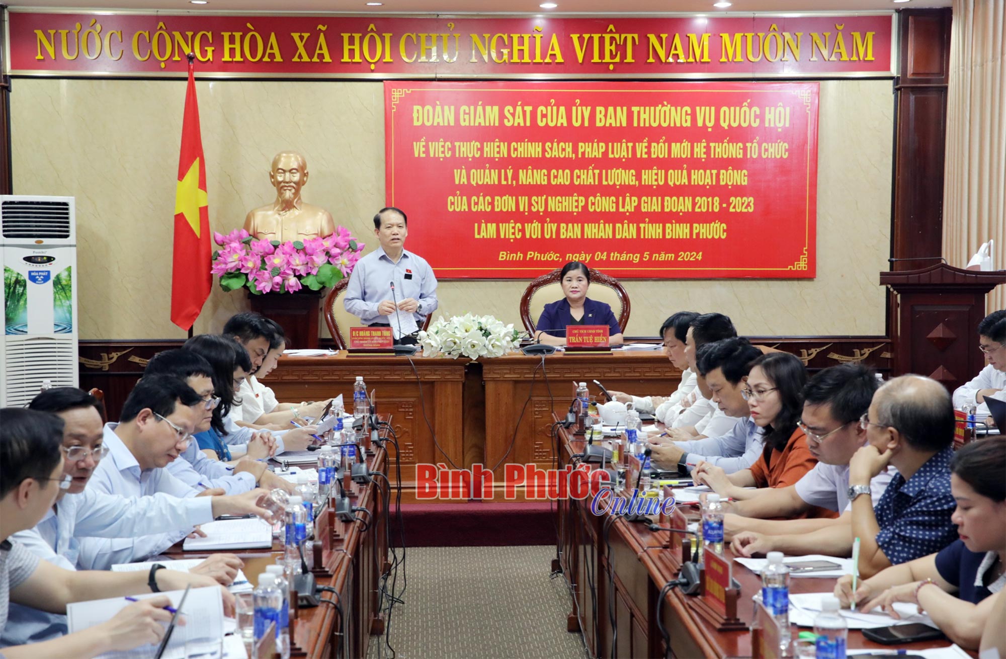 Ủy viên Trung ương Đảng, Chủ nhiệm Ủy ban Pháp luật của Quốc hội Hoàng Thanh Tùng nhấn mạnh: Việc thực hiện chính sách, pháp luật về đổi mới hệ thống tổ chức và quản lý, nâng cao chất lượng, hiệu quả hoạt động của các đơn vị sự nghiệp công lập là một trong những chuyên đề giám sát của Thường vụ Quốc hội và Bình Phước là một trong những tỉnh, thành Đoàn thực hiện giám sát. Đánh giá cao việc triển khai thực hiện của Bình Phước, ông Hoàng Thanh Tùng nhấn mạnh: Cũng như một số địa phương, trong quá trình triển khai thực hiện bên cạnh những kết quả ghi nhận, Bình Phước cũng gặp nhưng khó khăn nhất định. Do đó, đề nghị Bình Phước tổng hợp những kiến nghị cụ thể cũng như bản mục tiêu, phương án thực hiện trong thời gian tới, gửi về đoàn. Đoàn sẽ tổng hợp cùng với những kiến nghị của các địa phương và có báo cáo tổng thể trình Ủy ban Thường vụ Quốc hội, cũng như các bộ, ngành liên quan.