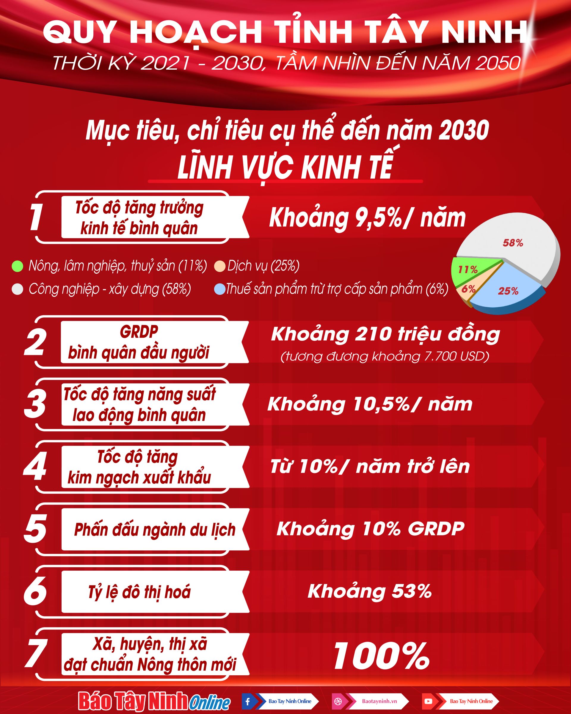 Thông qua Quy hoạch tỉnh thời kỳ 2021-2030, tầm nhìn đến năm 2050, tỉnh Tây Ninh truyền tải thông điệp: “Tây Ninh phát triển năng động, văn minh, có môi trường sống tốt, thích ứng với biến đổi khí hậu; Tây Ninh có hệ thống quản trị công hiệu quả, môi trường kinh doanh thân thiện; Tây Ninh Xanh; Môi trường sống hấp dẫn; Cửa ngõ thương mại quốc tế; Điểm đến hấp dẫn; Nhanh, toàn diện và bền vững”.