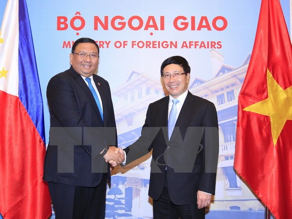 Phó Thủ tướng Chính phủ, Bộ trưởng Bộ Ngoại giao Phạm Bình Minh đón và hội đàm với Bộ trưởng Ngoại giao Philippines Jose Almendras đang thăm Việt NamTại buổi hội đàm, hai bên đã trao đổi các biện pháp triển khai nội hàm quan hệ Đối tác chiến lược (thiết lập tháng 11-2015), nhất là trong năm kỷ niệm 40 năm thiết lập quan hệ ngoại giao (12-7-1976-2016).