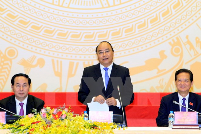 Thủ tướng Nguyễn Xuân Phúc phát biểu tại buổi gặp mặtTới dự có Chủ tịch nước Trần Đại Quang; Thủ tướng Chính phủ Nguyễn Xuân Phúc; nguyên Thủ tướng Chính phủ Nguyễn Tấn Dũng; Chủ tịch Quốc hội Nguyễn Thị Kim Ngân; nguyên Chủ tịch Quốc hội Nguyễn Sinh Hùng; Chủ tịch Ủy ban Trung ương Mặt trận Tổ quốc Việt Nam Nguyễn Thiện Nhân.