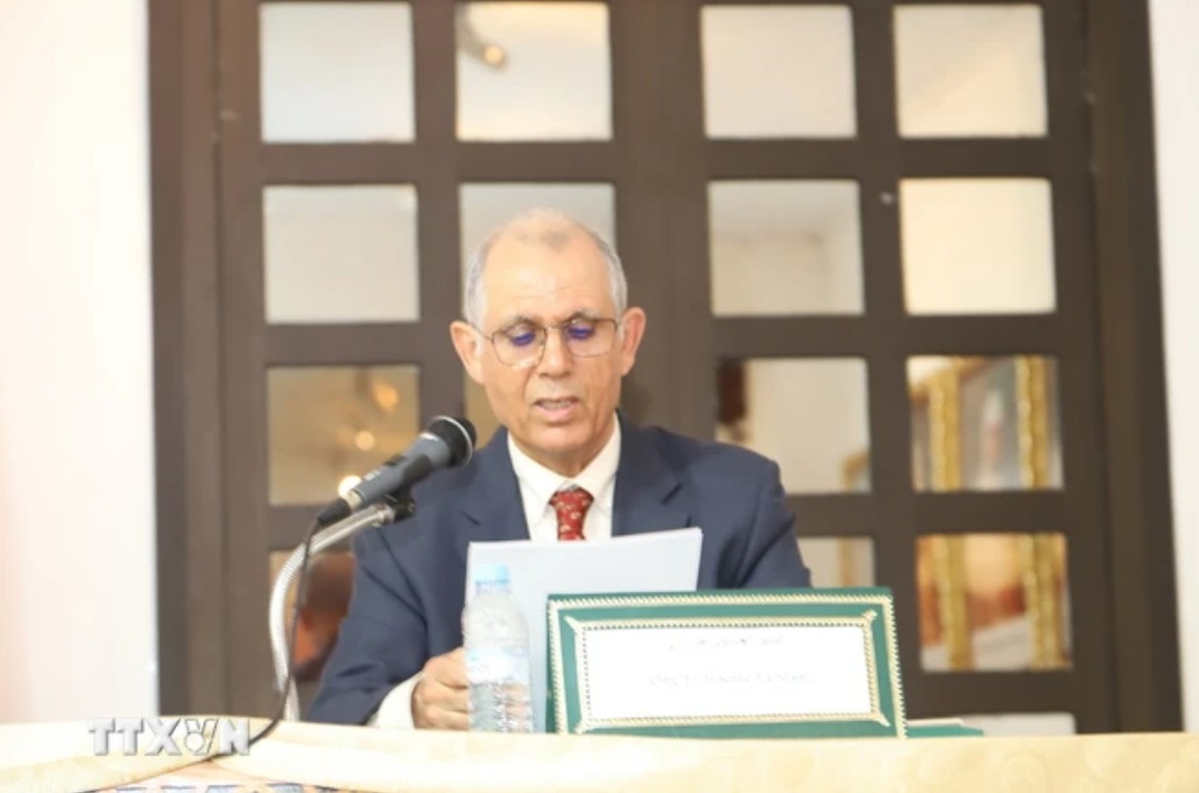 Ông El Houcine Fardani, nguyên Đại sứ Maroc tại Việt Nam với bài tham luận mang tên 'Quan hệ Việt Nam - Maroc: Hiện tại và triển vọng tương lai.' (Ảnh: Hồng Minh - PV TTXVN)