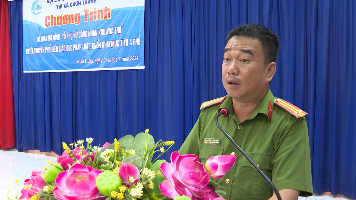 Trung tá Trần Tuấn Nghĩa, Trưởng Công an phường Minh Hưng, tuyên truyền phòng chống tội phạm và thực hiện “4 phủ” cho công nhân