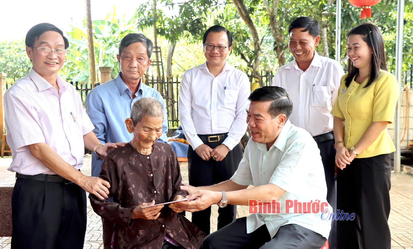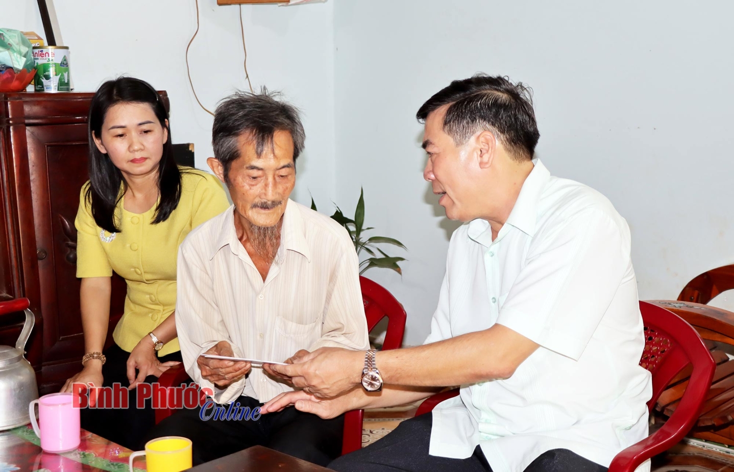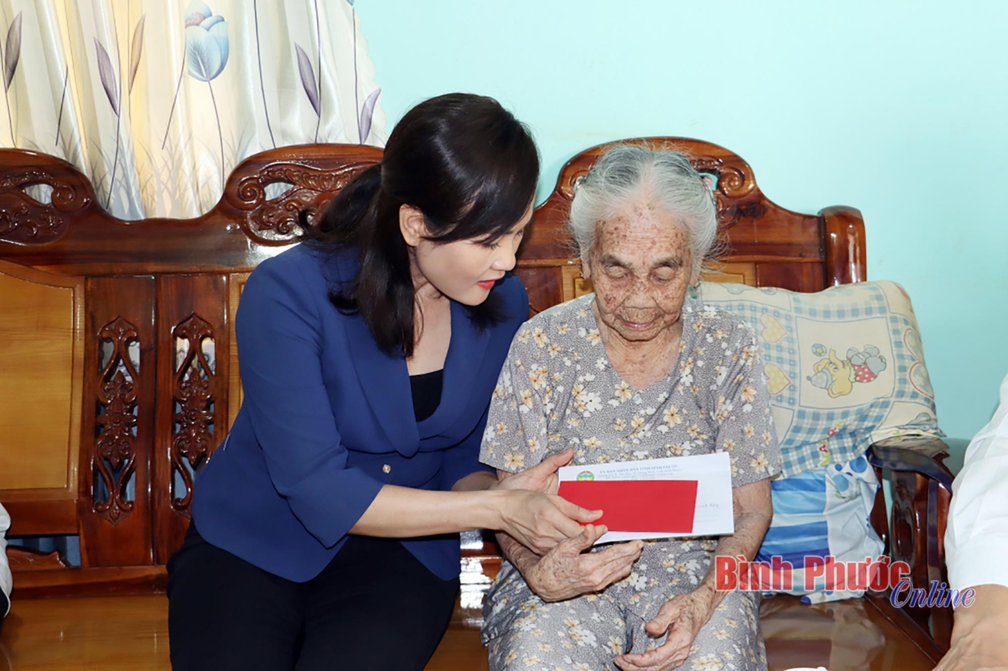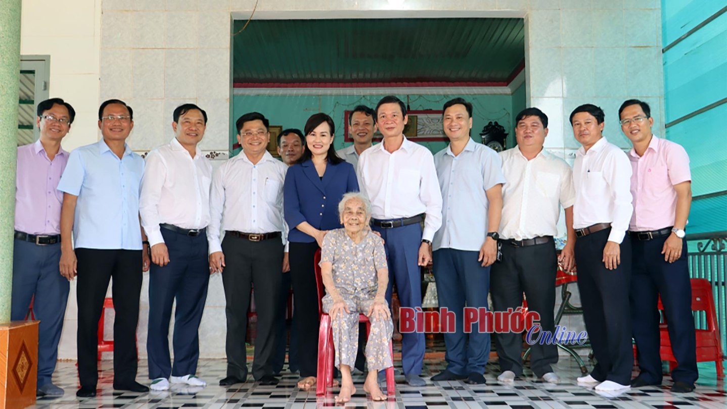 Ủy viên Ban Thường vụ, Chủ nhiệm Ủy ban Kiểm tra Tỉnh ủy Giang Thị Phương Hạnh và Bí thư Huyện ủy Bù Đăng Vũ Lương hỏi thăm sức khỏe mẹ Việt Nam anh hùng Trần Thị Bảy