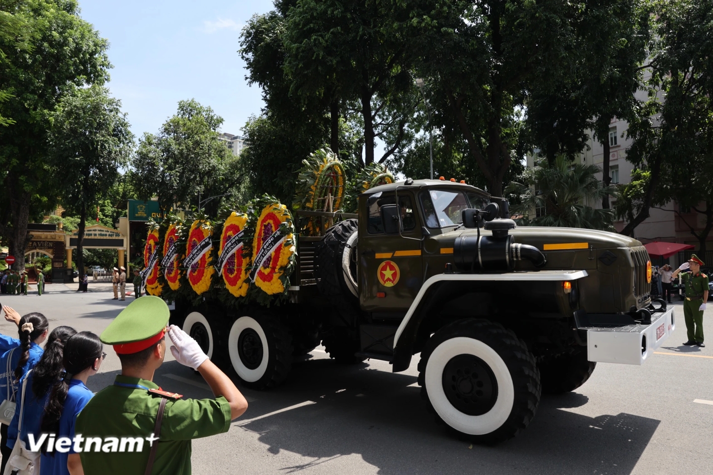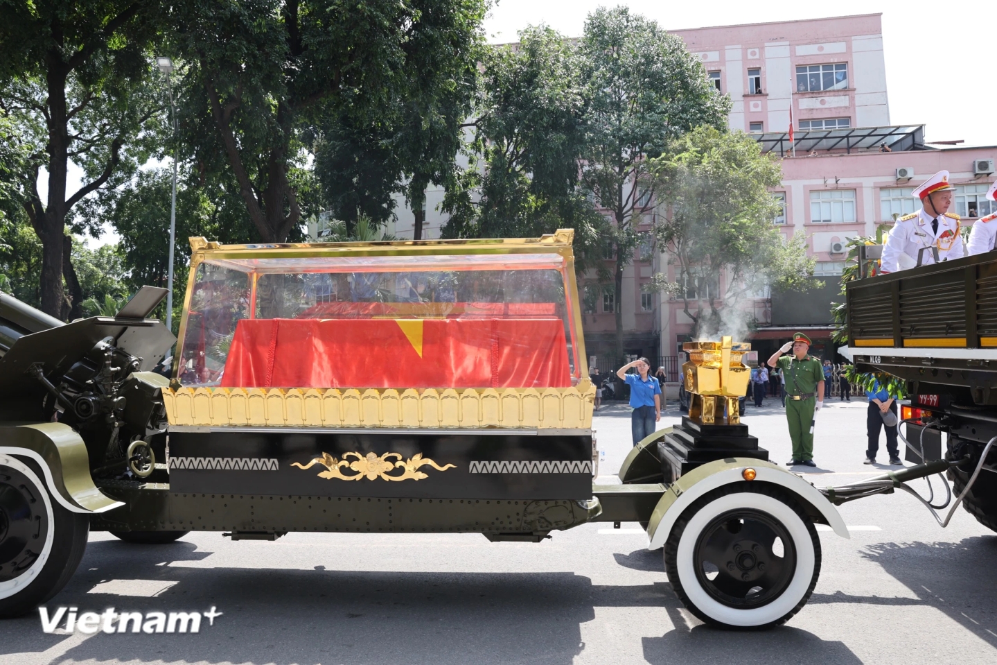 Xe chở linh cữu Tổng Bí thư Nguyễn Phú Trọng rời Nhà tang lễ Quốc gia. (Ảnh: TTXVN)