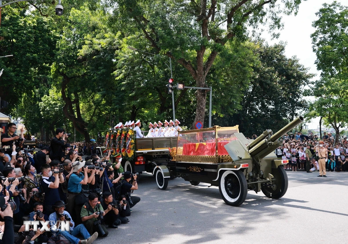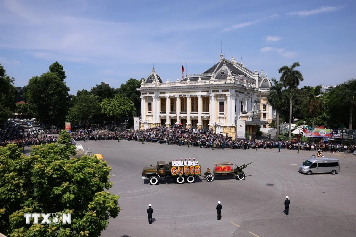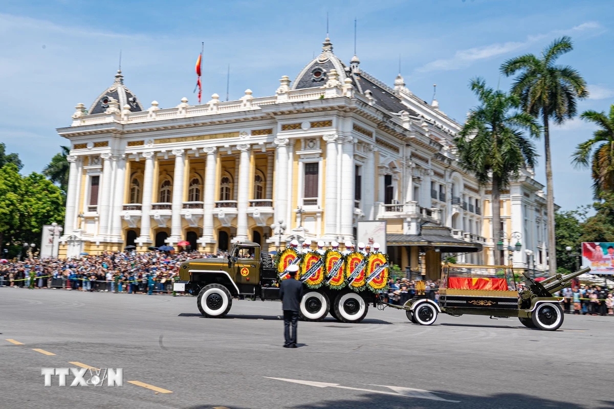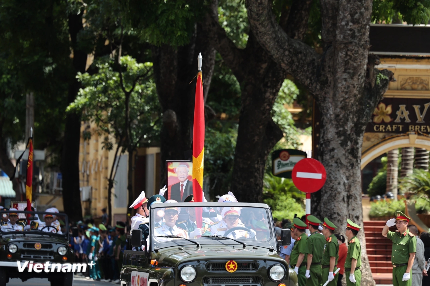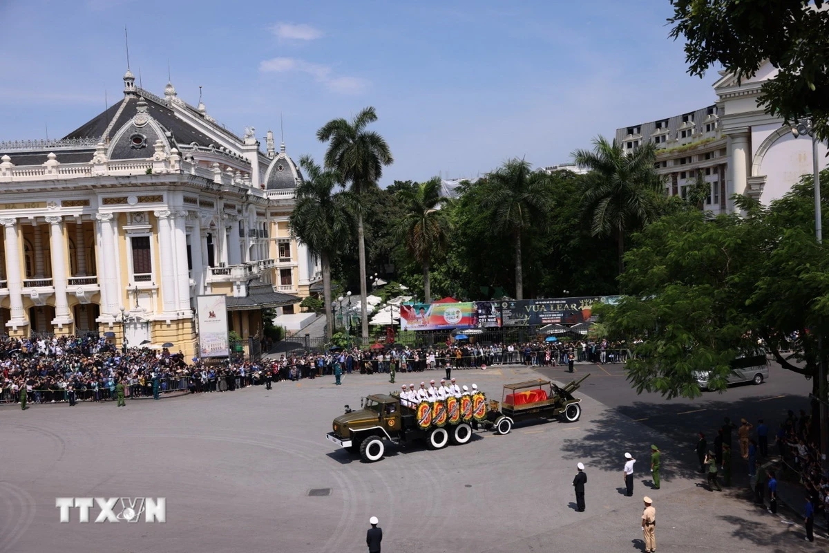 Đoàn xe nghi lễ đưa linh cữu Tổng Bí thư Nguyễn Phú Trọng đi qua Quảng trường Cách mạng tháng 8. (Ảnh: TTXVN)