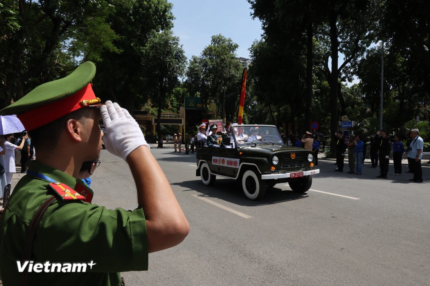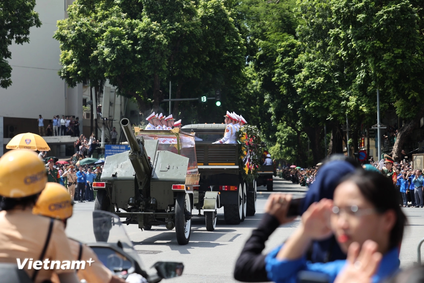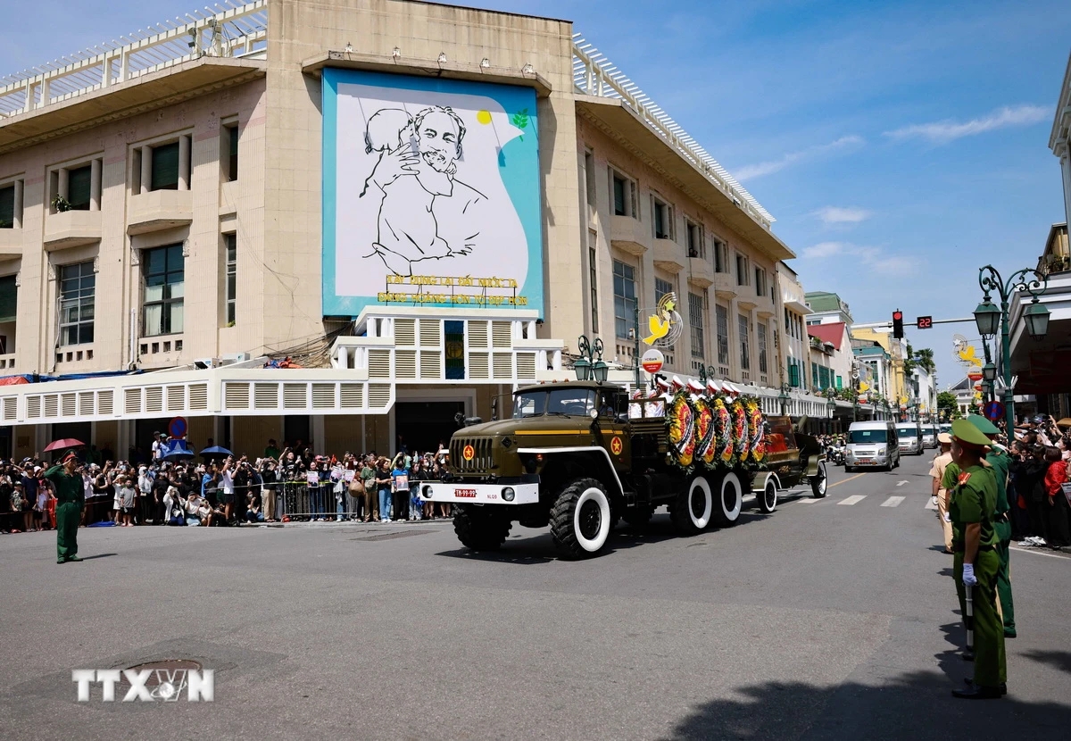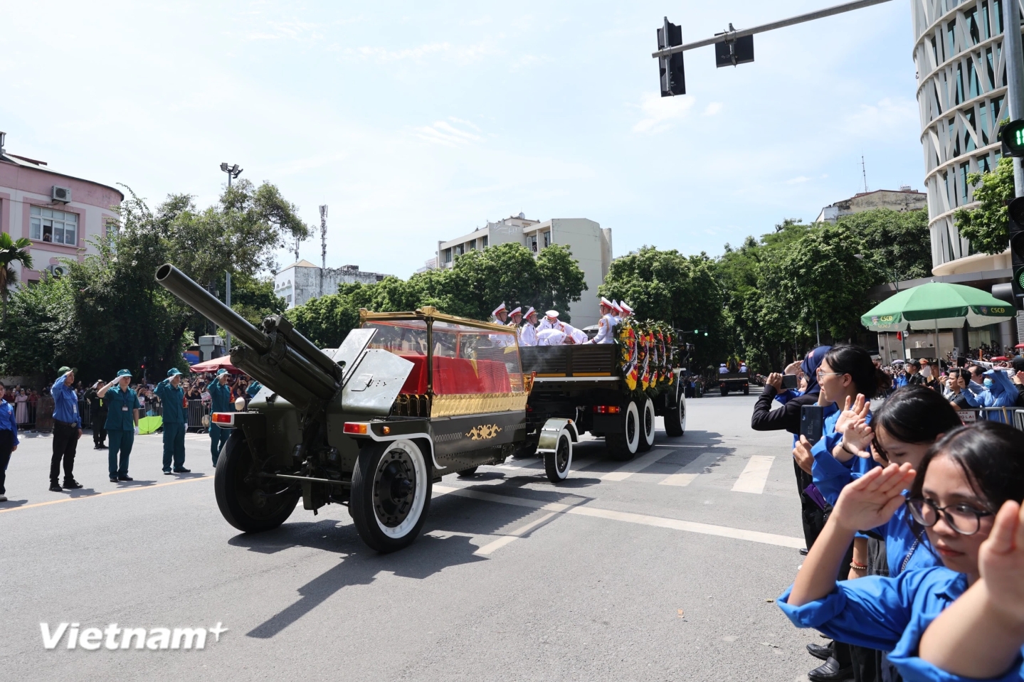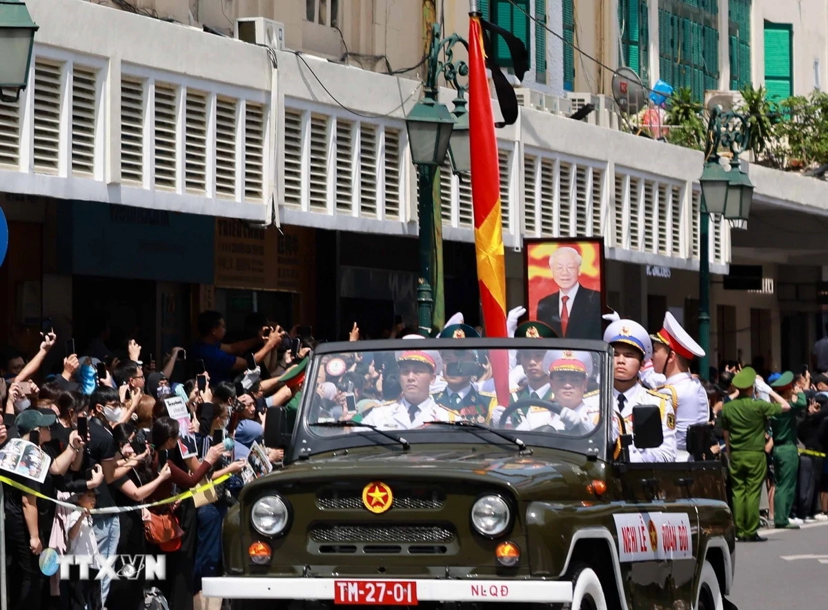 Đoàn xe nghi lễ đưa linh cữu Tổng Bí thư Nguyễn Phú Trọng đi qua Quảng trường Cách mạng tháng 8. (Ảnh: TTXVN)