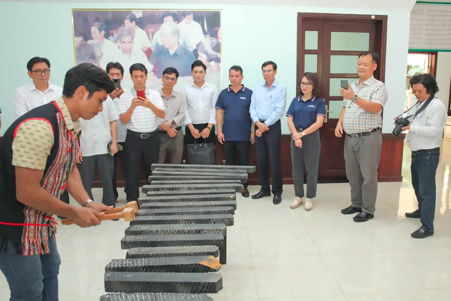 Đại biểu trải nghiệm đánh đàn đá tại Khu bảo tồn văn hóa S’tiêng sóc Bom Bo