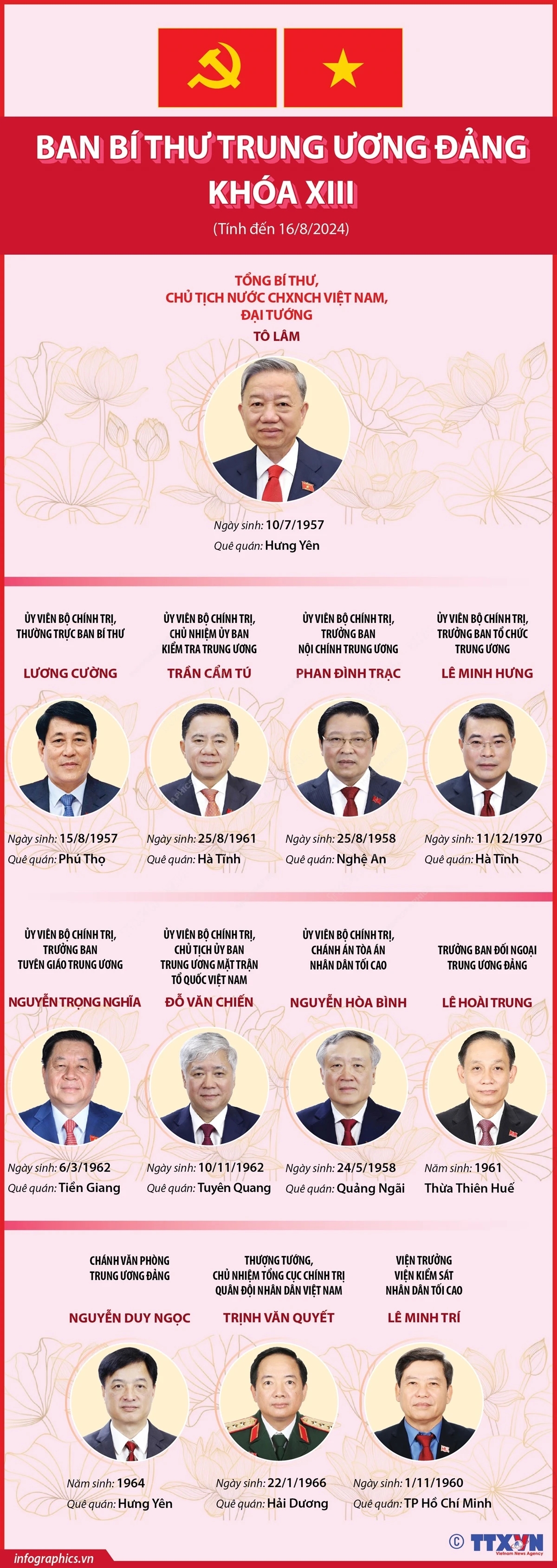 Như vậy, tính đến ngày 16-8-2024, Ban Bí thư Trung ương Đảng khóa XIII có 12 đồng chí Ủy viên.