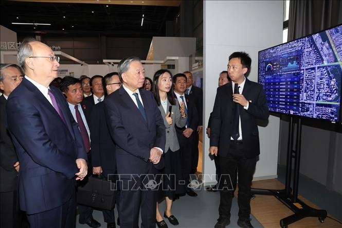 Tổng Bí thư, Chủ tịch nước Tô Lâm tham quan các gian giới thiệu công nghệ của Công ty MEGVII. Ảnh: Trí Dũng/TTXVN