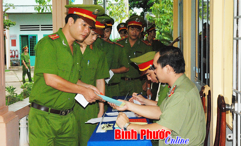 Các cán bộ, chiến sĩ Trại tạm giam Công an Bình Phước cầm lá phiếu bầu cử