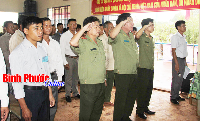Đại tá Trần Thắng Phúc, Giám đốc Công an tỉnh và các cử tri thực hiện nghi thức chào cờ ở Tổ bầu cử số 9, thôn Bù Gia Phúc II