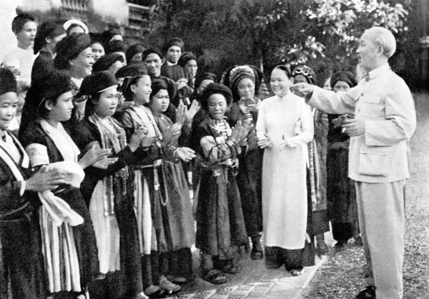 Ðại biểu phụ nữ các dân tộc tỉnh Hà Giang về thăm Hà Nội vui mừng được gặp Chủ tịch Hồ Chí Minh (ngày 25-11-1965) - Ảnh tư liệu