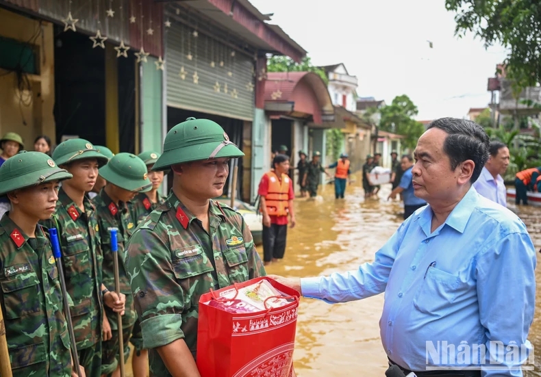 Chủ tịch Quốc hội Trần Thanh Mẫn thăm hỏi, tặng quà lực lượng làm nhiệm vụ khắc phục hậu quả mưa lũ tại xã Nga My, huyện Phú Bình |