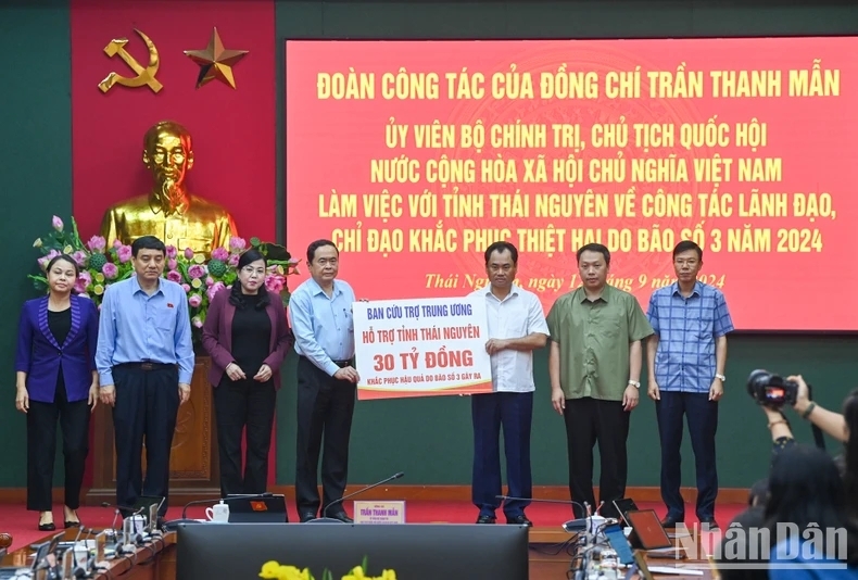 Chủ tịch Quốc hội Trần Thanh Mẫn trao hỗ trợ tỉnh Thái Nguyên 30 tỷ đồng khắc phục hậu quả bão số 3 |
