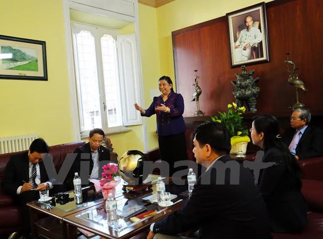Trước đó, chiều 27-5, Phó Chủ tịch Quốc hội Tòng Thị Phóng và các thành viên trong đoàn công tác đã đến thăm và nói chuyện thân mật với cán bộ, nhân viên Đại sứ quán Việt Nam tại Italy, kiều bào và du học sinh Việt Nam đang sinh sống, học tập và làm việc tại Italy.