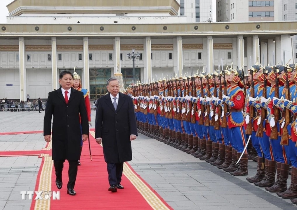 Tổng Bí thư, Chủ tịch nước Tô Lâm cùng Tổng thống Mông Cổ Ukhnaagiin Khurelsukh duyệt đội danh dự. (Ảnh: Trí Dũng/TTXVN)