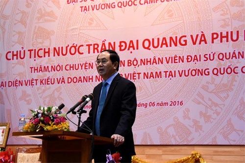 Tối 14-6, Chủ tịch nước Trần Đại Quang đã tới thăm và nói chuyện với cán bộ nhân viên Đại sứ quán, đại diện Việt kiều và doanh nghiệp Việt Nam tại Vương quốc Campuchia.