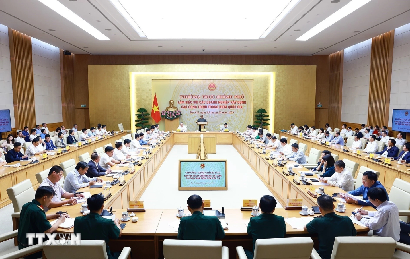 Chiều 3-10, tại Trụ sở Chính phủ, Thủ tướng Chính phủ Phạm Minh Chính chủ trì cuộc làm việc giữa Thường trực Chính phủ với các doanh nghiệp xây dựng nhằm tháo gỡ khó khăn, vướng mắc, thúc đẩy triển khai các công trình trọng điểm quốc gia.