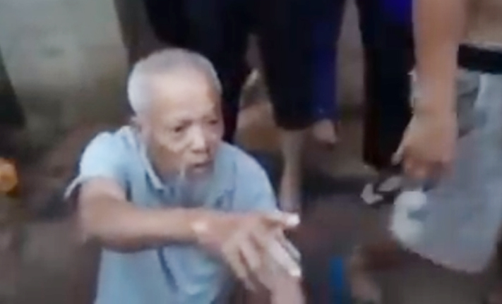Trong ảnh: Ông Nghinh 77 tuổi ở xã Long Hà, huyện Phú Riềng được đăng tải trên mạng xã hội youtube. Lúc này, ông Nghinh đang ngồi vừa khua tay vừa nói với đám đông, trên mặt không có vết thương, không có vết máu và phát súng chỉ thiên do công an bắn đã xảy ra trước đó 30 phút. Thế nhưng trang mạng youtube lại giật tít là “Công an bắn chết cụ ông 77 tuổi ở Phú Riềng, Bình Phước” |