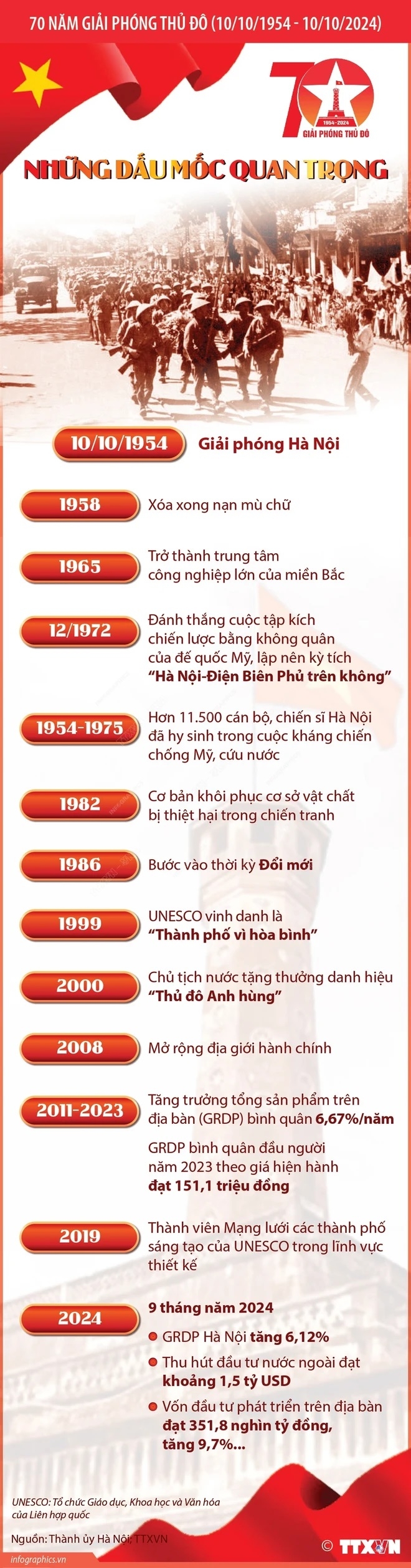 70 năm trước, ngày 10-10-1954, Thủ đô Hà Nội được giải phóng, mở đầu thời kỳ xây dựng chủ nghĩa xã hội ở miền Bắc và đấu tranh giải phóng miền Nam, thống nhất đất nước.