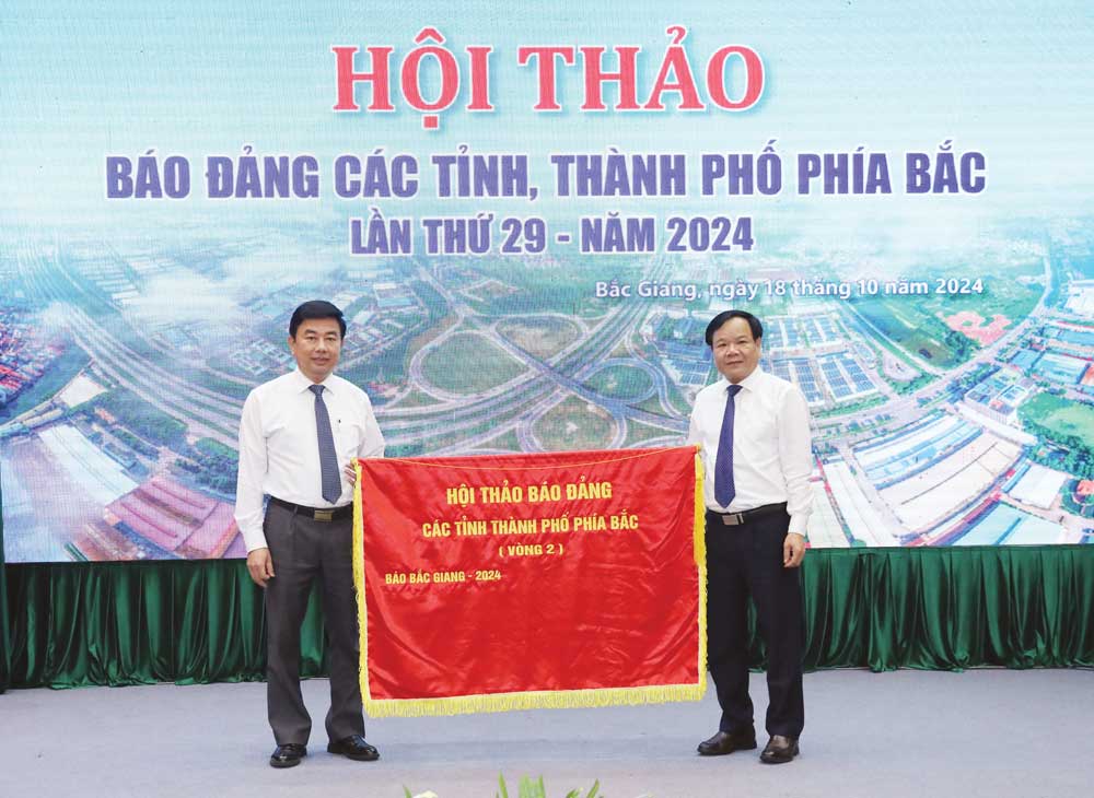 Đồng chí Trịnh Văn Ánh, Tổng Biên tập Báo Bắc Giang trao cờ đăng cai hội thảo lần sau cho đồng chí Nguyễn Minh Đức, Tổng Biên tập Báo Hànộimới. |