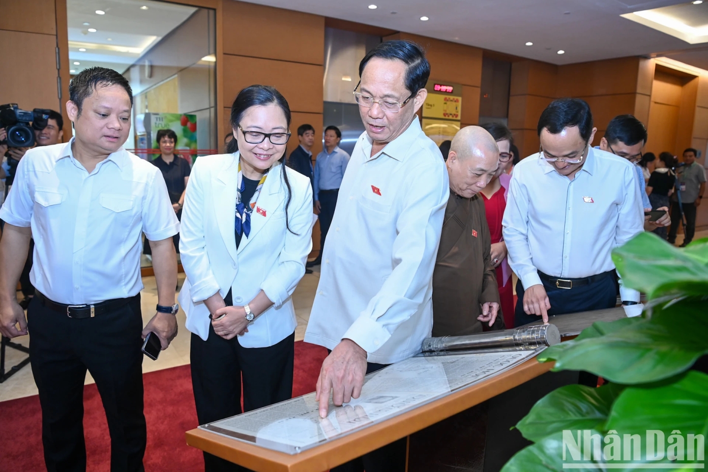 Chủ tịch nước Lương Cường, Chủ tịch Quốc hội Trần Thanh Mẫn cùng các đồng chí lãnh đạo Đảng, Nhà nước nghe giới thiệu về Triển lãm |