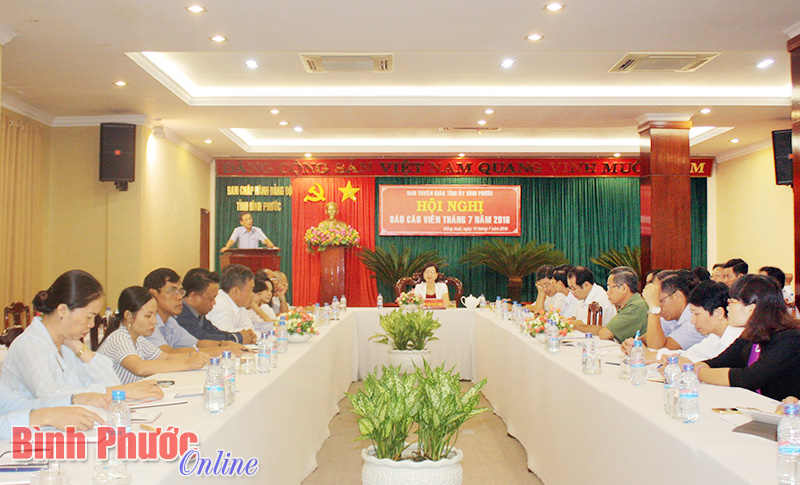 Đồng chí Trần Tuyết Minh, Ủy viên Ban Thường vụ, Trưởng ban Tuyên giáo Tỉnh ủy chủ trì hội nghị. Đại tá Vũ Tiến Điền, Chính ủy Bộ chỉ huy Quân sự tỉnh báo cáo chuyên đề đấu tranh phản bác các luận điệu xuyên tạc, chống phá của các thế lực thù địch trên mạng xã hội. Phó giám đốc Bảo hiểm xã hội tỉnh Trần Bình Đức báo cáo tình hình tham gia bảo hiểm 6 tháng đầu năm, những vấn đề đặt ra 6 tháng cuối năm. Phó ban Tuyên giáo Tỉnh ủy Nguyễn Công Sởi báo cáo kết quả chuyến thăm Việt Nam của Tổng thống Hoa Kỳ Barack Obama, quan hệ Việt Nam - Hoa Kỳ thời gian qua và dự báo thời gian tới. Giám đốc Trung tâm Thông tin công tác tuyên giáo (Ban Tuyên giáo Tỉnh ủy) Phạm Văn Triều báo cáo về giải quyết sự cố môi trường gây hải sản chết bất thường tại các tỉnh từ Hà Tĩnh đến Thừa Thiên - Huế. Phó chủ nhiệm thường trực Ủy ban Kiểm tra Tỉnh ủy Giang Thị Phương Hạnh báo cáo kết quả công tác kiểm tra, giám sát của Tỉnh ủy 6 tháng đầu năm, phương hướng, nhiệm vụ 6 tháng cuối năm.