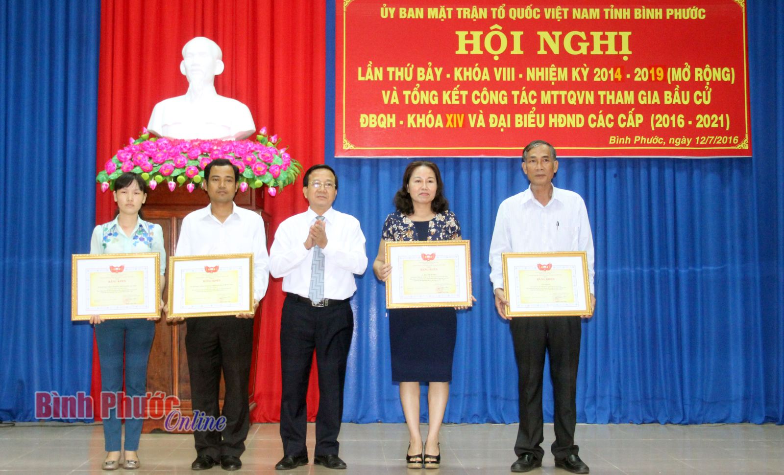Chủ tịch UBMTTQVN tỉnh Nguyễn Quang Toản trao bằng khen của Trung ương MTTQVN cho 3 tập thể và 1 cá nhân có thành tích trong công tác tổ chức bầu cử