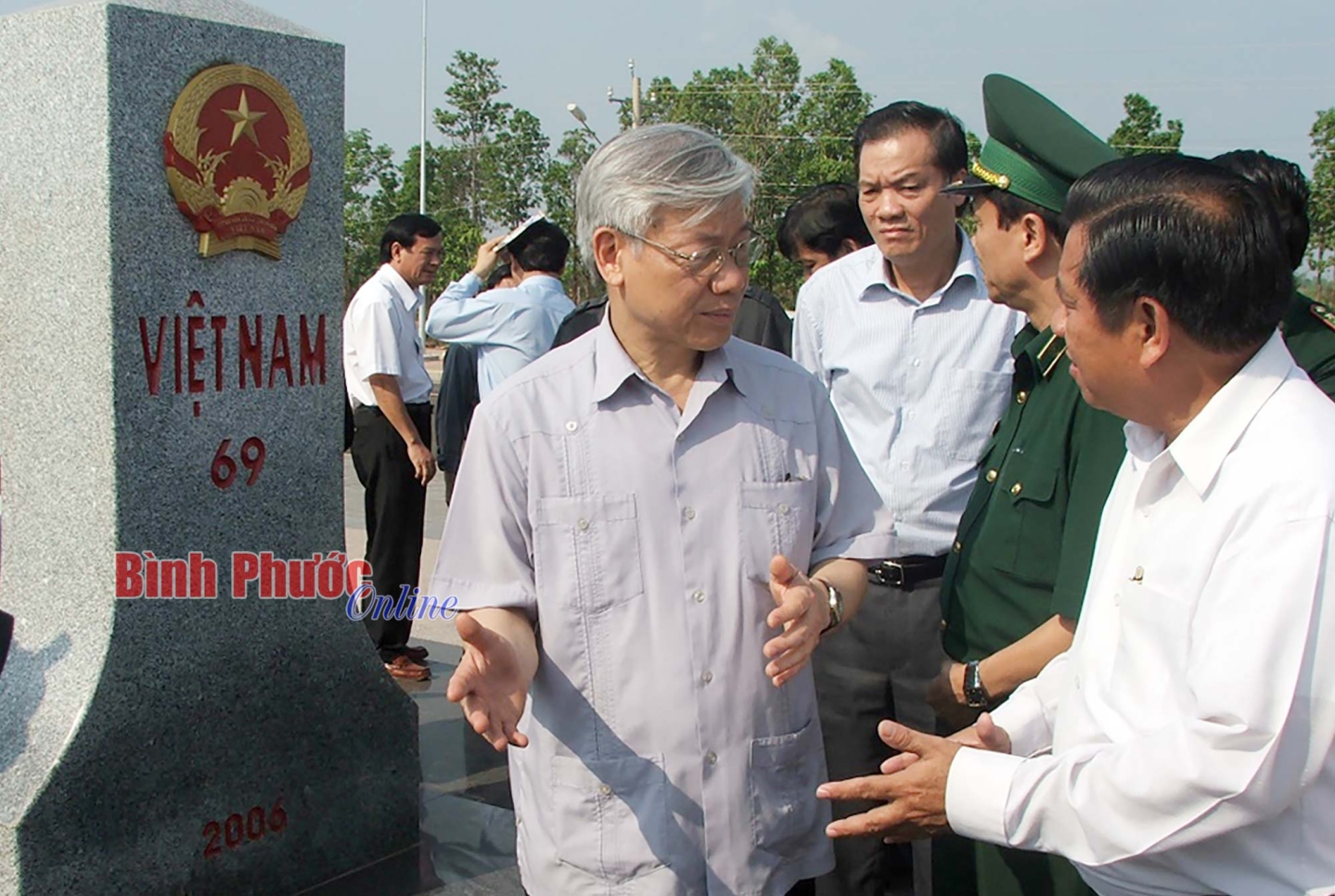 Đồng chí Nguyễn Phú Trọng thăm cột mốc biên giới Việt Nam - Campuchia trong chuyến thăm và làm việc tại tỉnh Bình Phước năm 2009