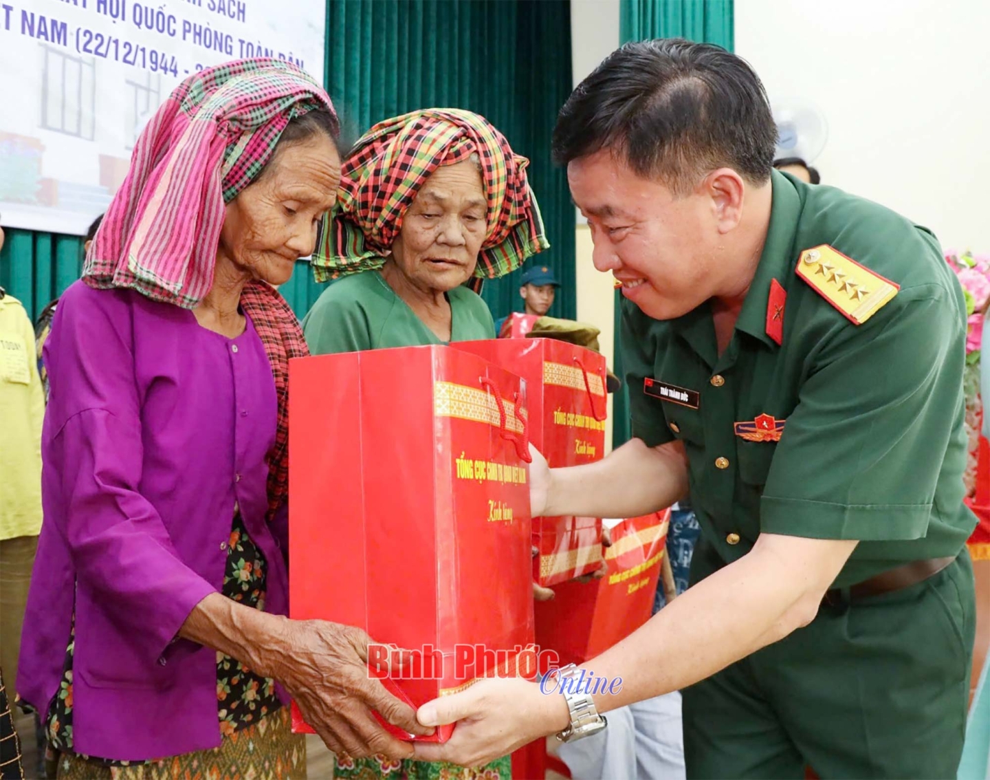Cán bộ Cục Chính trị trao quà cho bà con đồng bào dân tộc thiểu số hoàn cảnh khó khăn tại huyện Lộc Ninh